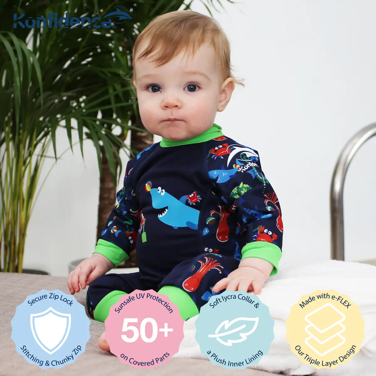 Keep your little one warm and happy in the water with the Konfidence Splashy Swimsuit in a charming Fergal the Fish design. Made from soft and sustainable e-Flex fabric—crafted using recycled plastic—this eco-friendly baby swimsuit is lined with plush fleece to provide gentle warmth, making it ideal for cooler pools or seaside dips. The stretchy Lycra hems ensure a snug yet flexible fit, helping your baby move freely as they grow more confident in the water.