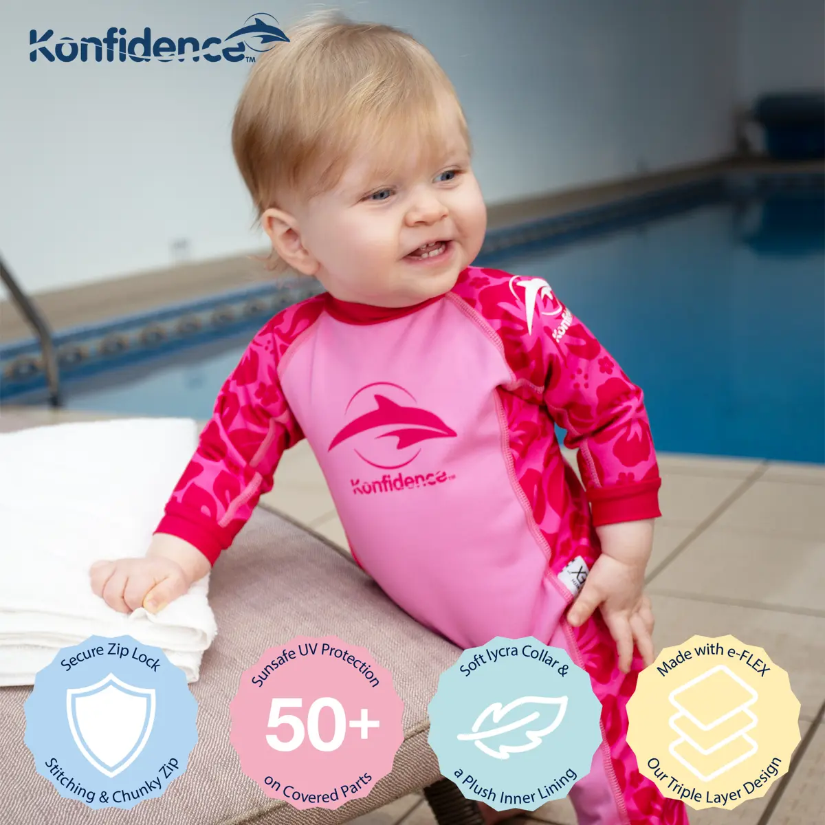 Keep little swimmers cosy and confident with the Konfidence™ Splashy Swimsuit in the sweet Oahu Pink design. With its soft fleece lining and flexible fit, it’s perfect for toddlers exploring the water with growing independence. Whether it’s swim lessons or seaside fun, this eco-conscious suit keeps them warm and protected with every splash.