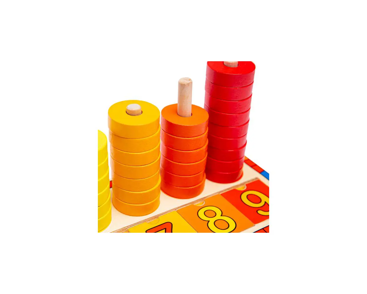 Match the numbered squares to the dots on the base of the puzzle and then count the brightly coloured discs as they are placed onto their individual pegs.