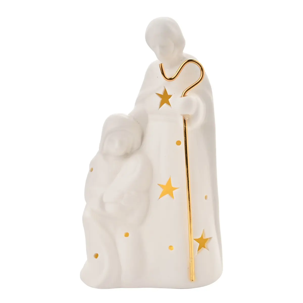 Celebrate the true spirit of Christmas with our elegant ceramic Mary and Joseph nativity figurine. This beautifully crafted piece features a warm LED light and delicate golden accents, that will illuminate your nativity scene with a serene glow. The intricate details and fine craftsmanship make it perfect as a keepsake or a heartfelt gift. Dimensions 15.5 x 8.5 x 5.5cm
