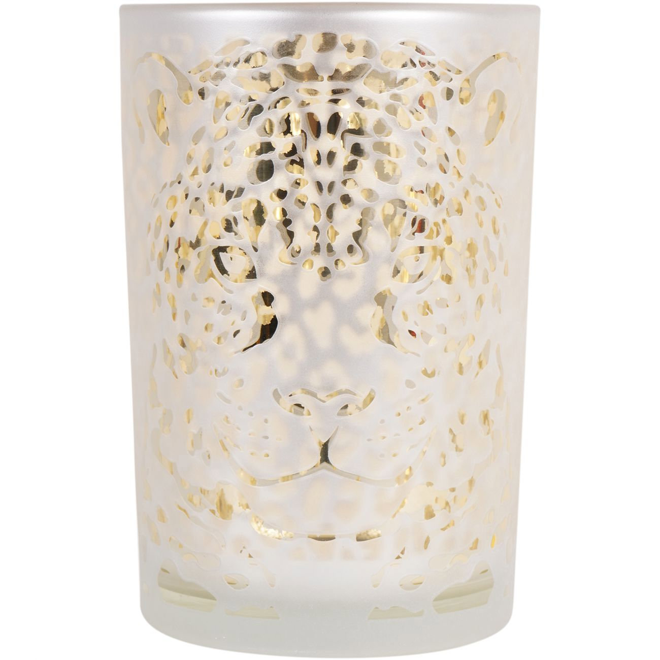 Add a touch of safari-inspired elegance to your space with this striking leopard print glass candle holder from LIBRA. Featuring a silver exterior and a champagne gold interior, the design showcases leopards head print on the outside of the glass, creating a bold yet graceful look.
