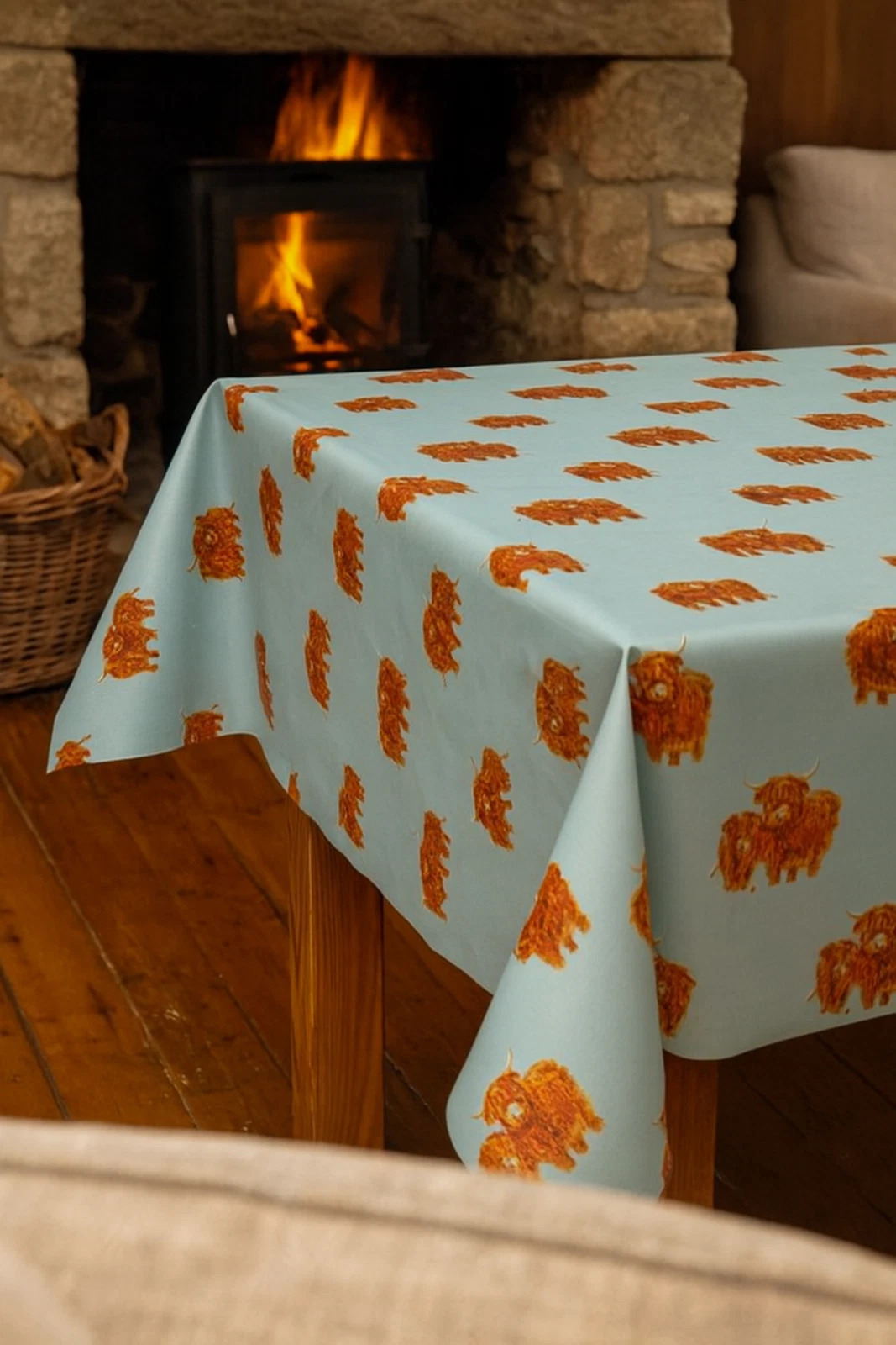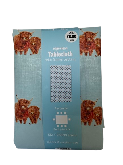This Limited Edition Festive Highland Cow tablecloth adds a cosy, countryside charm to your dining space. Designed with a delightful Highland Cow pattern, it brings a festive touch perfect for gatherings with family and friends. The rectangular cloth measures approximately 132 x 230 cm, comfortably fitting a table for 6 to 8 people.