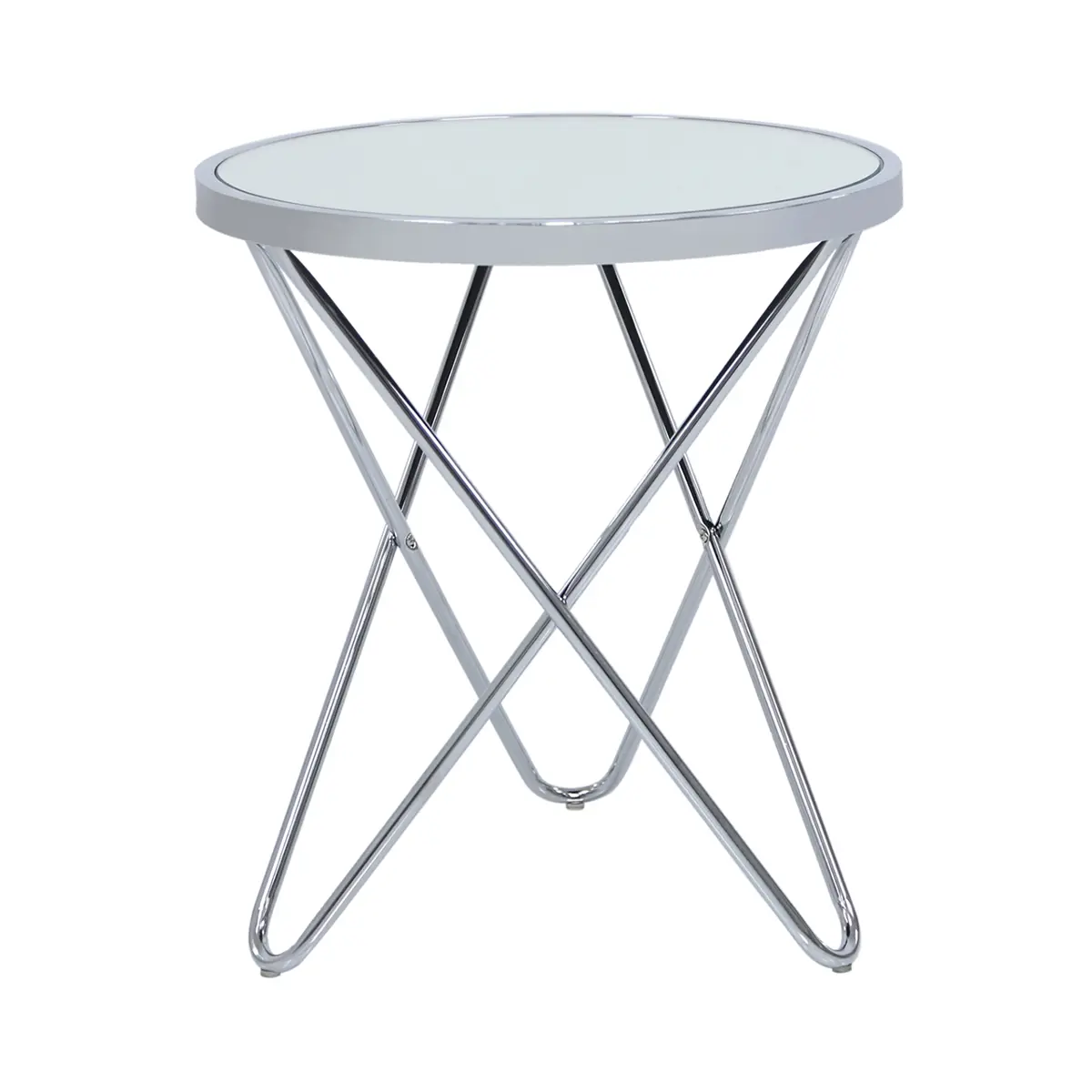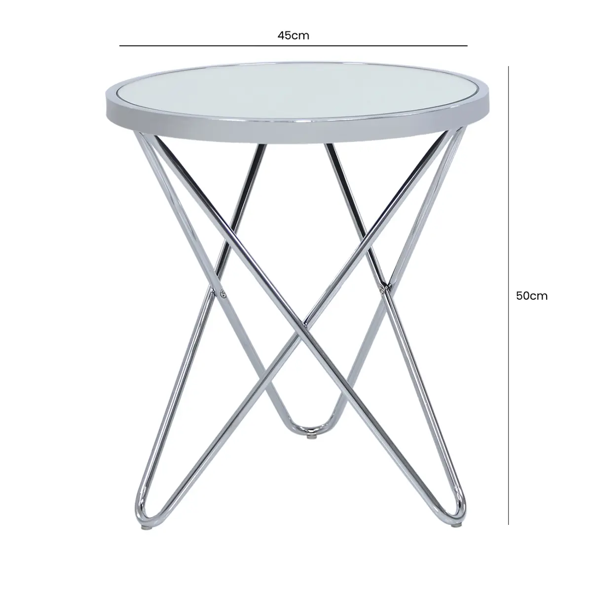 Enhance your home décor with the Lina Home Atom Chrome & Mirror Glass End Table. The table's sturdy chrome legs, intricately designed in a criss-cross pattern, provide a solid base for the round glass tabletop. Place it beside your favourite armchair or sofa, and it becomes the perfect spot to rest your coffee cup, magazines, or tipple.