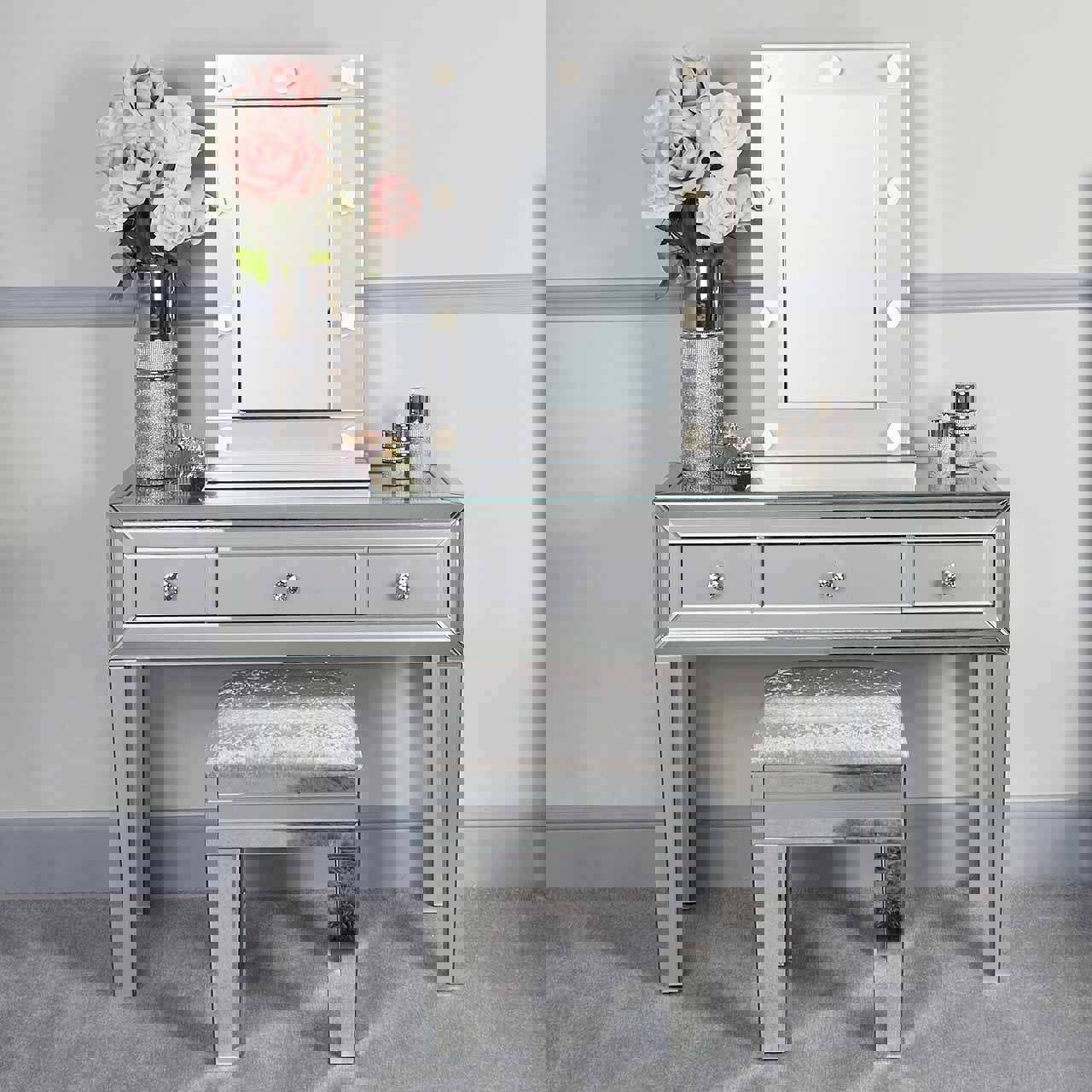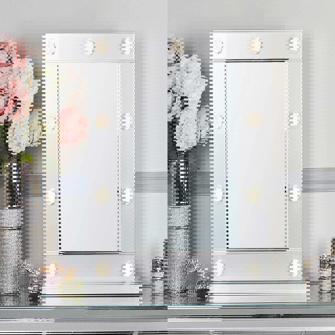 Adorned with grey-toned edging and 9 radiant bulbs, the Lina Home Broadway Vanity Mirror is a captivating centrepiece that will transform your dressing area. The energy-efficient LED bulbs provide soft, flattering illumination, while the dimmer switch allows you to adjust the brightness to your preference.