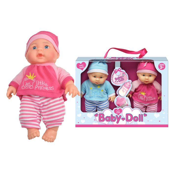 9" Vinyl Twin Baby Dolls. The twin dolls come in cute blue and pink outfits with matching hats. Enjoy hours of fun, this set is perfect for pretend play. Encourages imaginative and creative play. Suitable for Ages 3+.