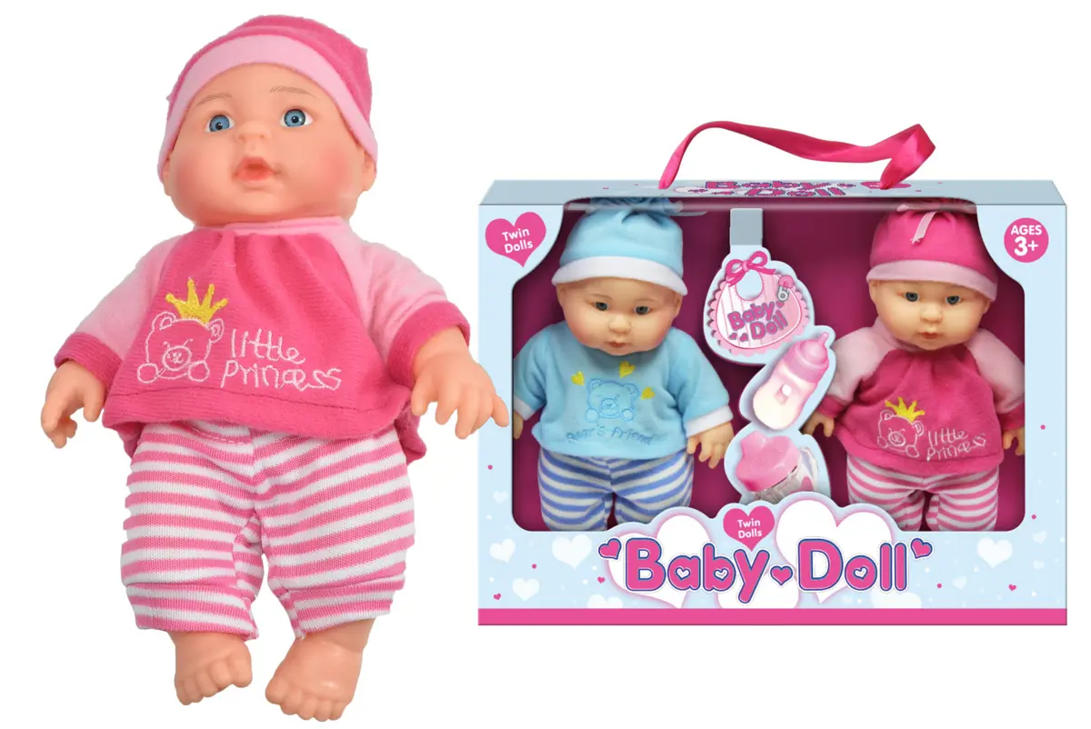 9" Vinyl Twin Baby Dolls. The twin dolls come in cute blue and pink outfits with matching hats. Enjoy hours of fun, this set is perfect for pretend play. Encourages imaginative and creative play. Suitable for Ages 3+.