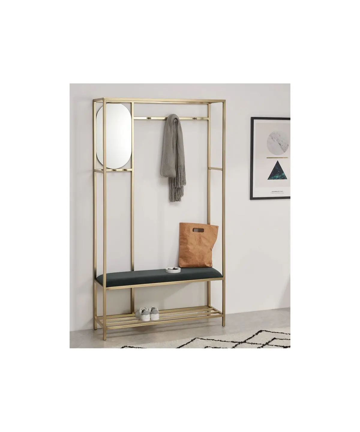 Featuring a brushed brass structure with an in-built plush velvet seat, it offers a comfortable spot to sit while putting on shoes. A discreet mirror tucked into the upper corner is ideal for last-minute checks, while the integrated shoe rack helps keep clutter neatly out of sight.