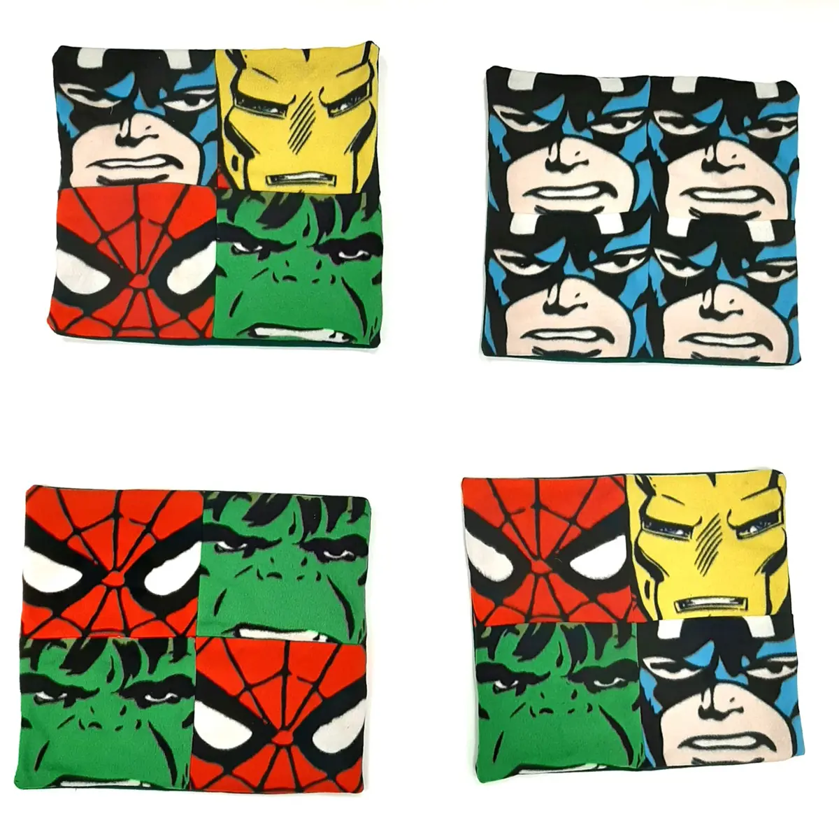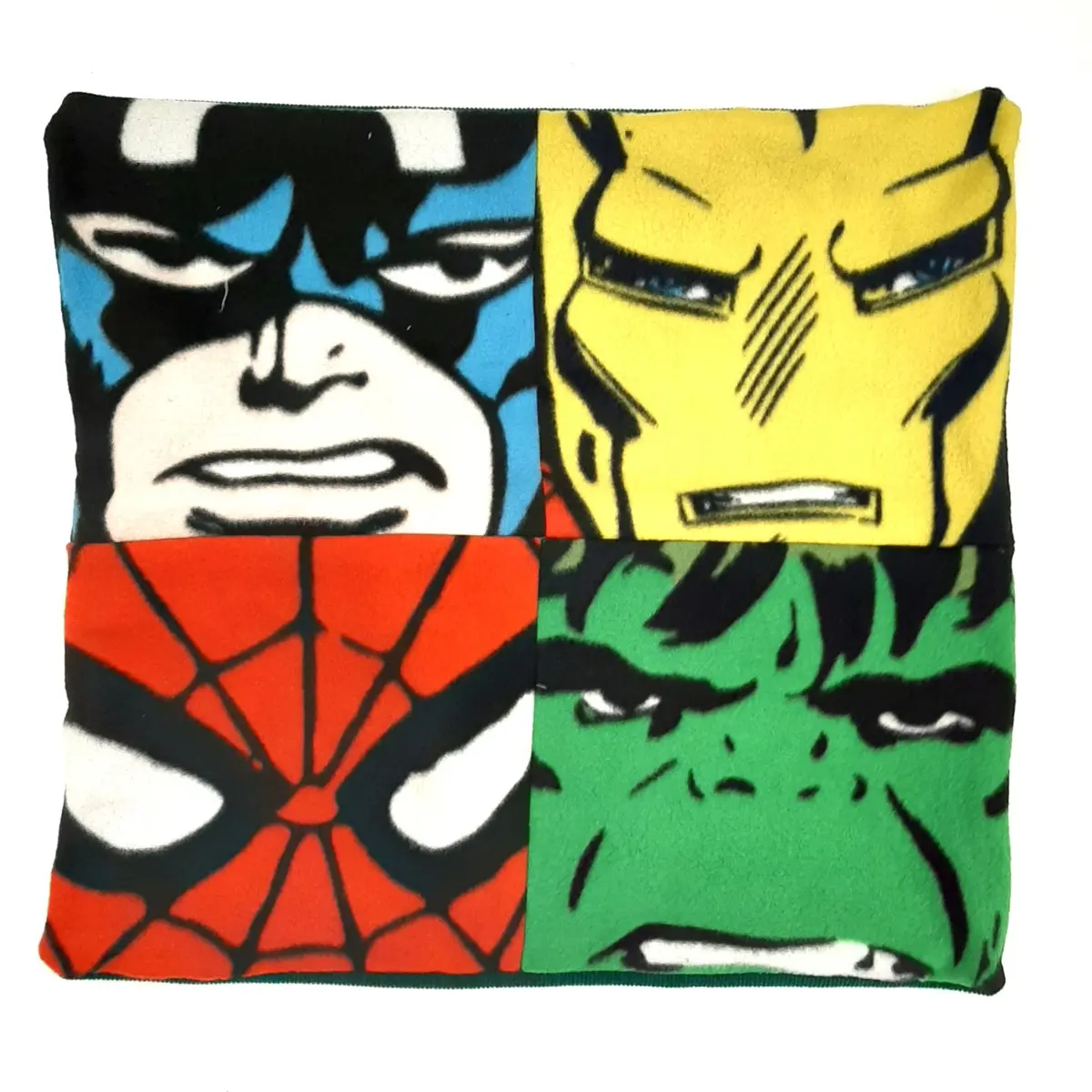 Add bold character to your home décor with this set of four Marvel Up-Cycled Cushion Covers, re-fashioned from a blanket throw. Featuring vibrant portraits of Captain America, Iron Man, Hulk, and Spider-Man, each cover brings a fun comic book touch to your living space while promoting sustainable style.