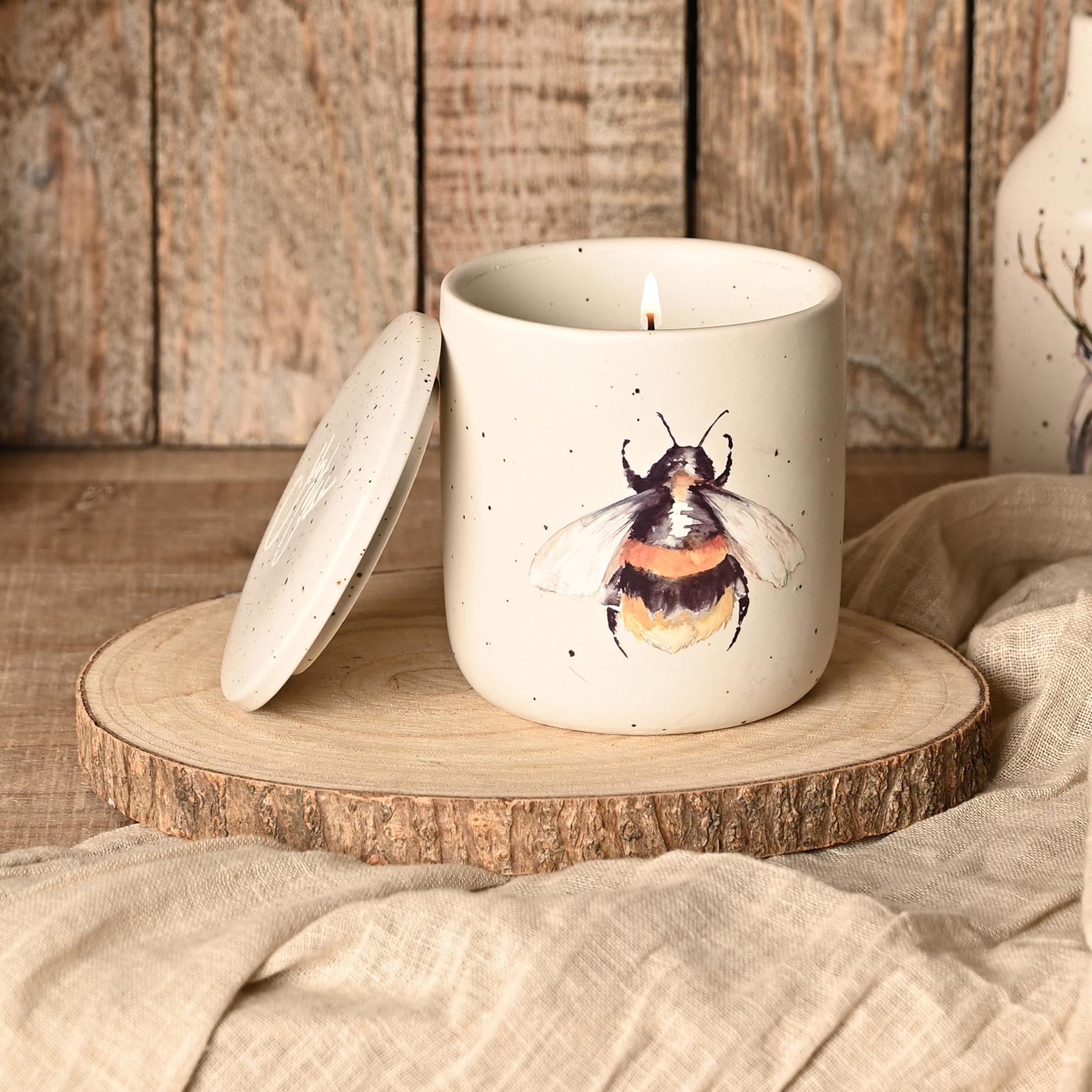 The ceramic candle holder showcases a white speckled finish, complete with printed bee illustration and matching Meg Hawkins signature lid. It houses a beautifully scented honeysuckle blossom soy wax candle which boasts an impressive burn time of 42 hours.