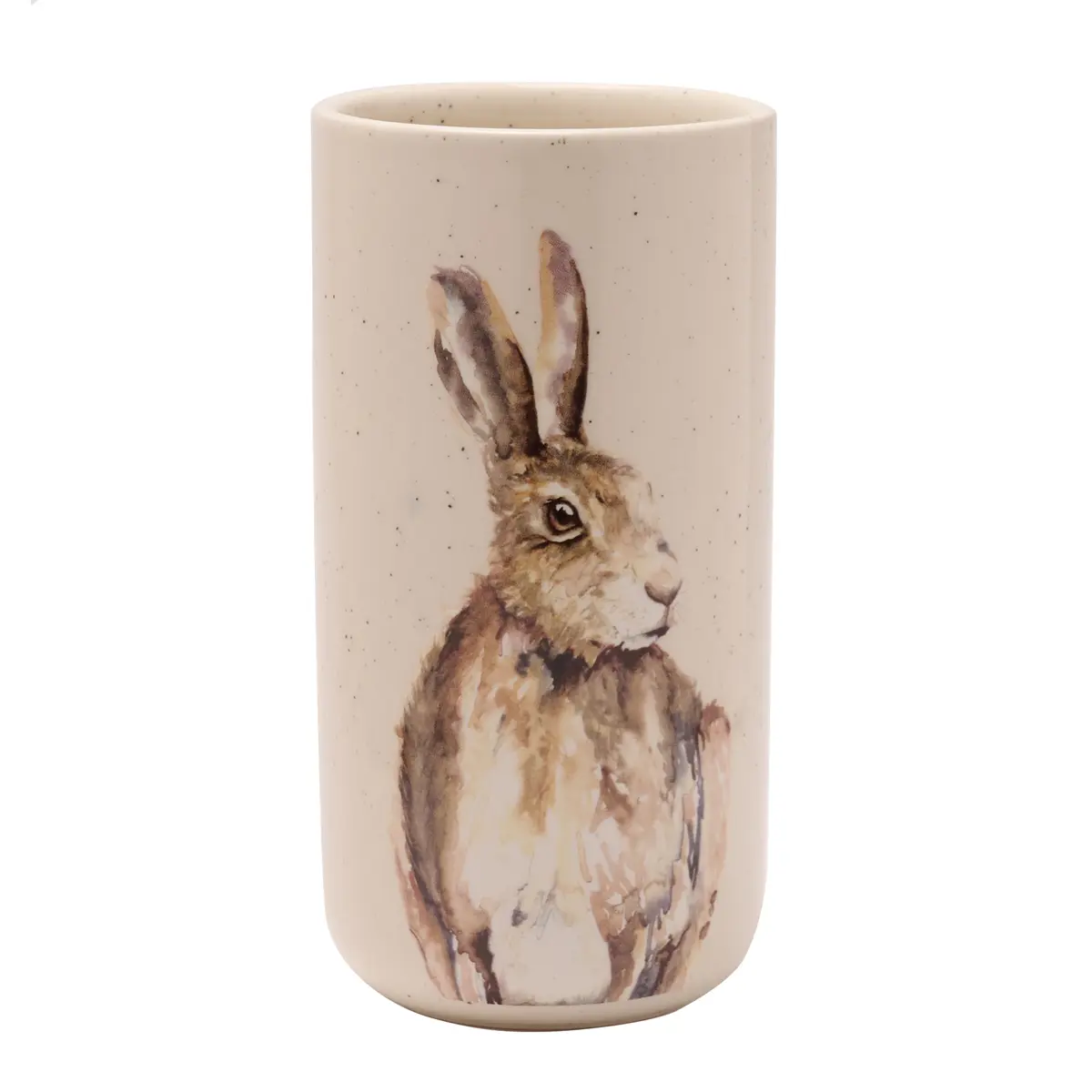 The tall vase showcases white, speckled ceramic, complete with gloss finish and a beautiful hare image from Meg Hawkins. Its wide opening provides ample space in which to present beautiful flower displays.