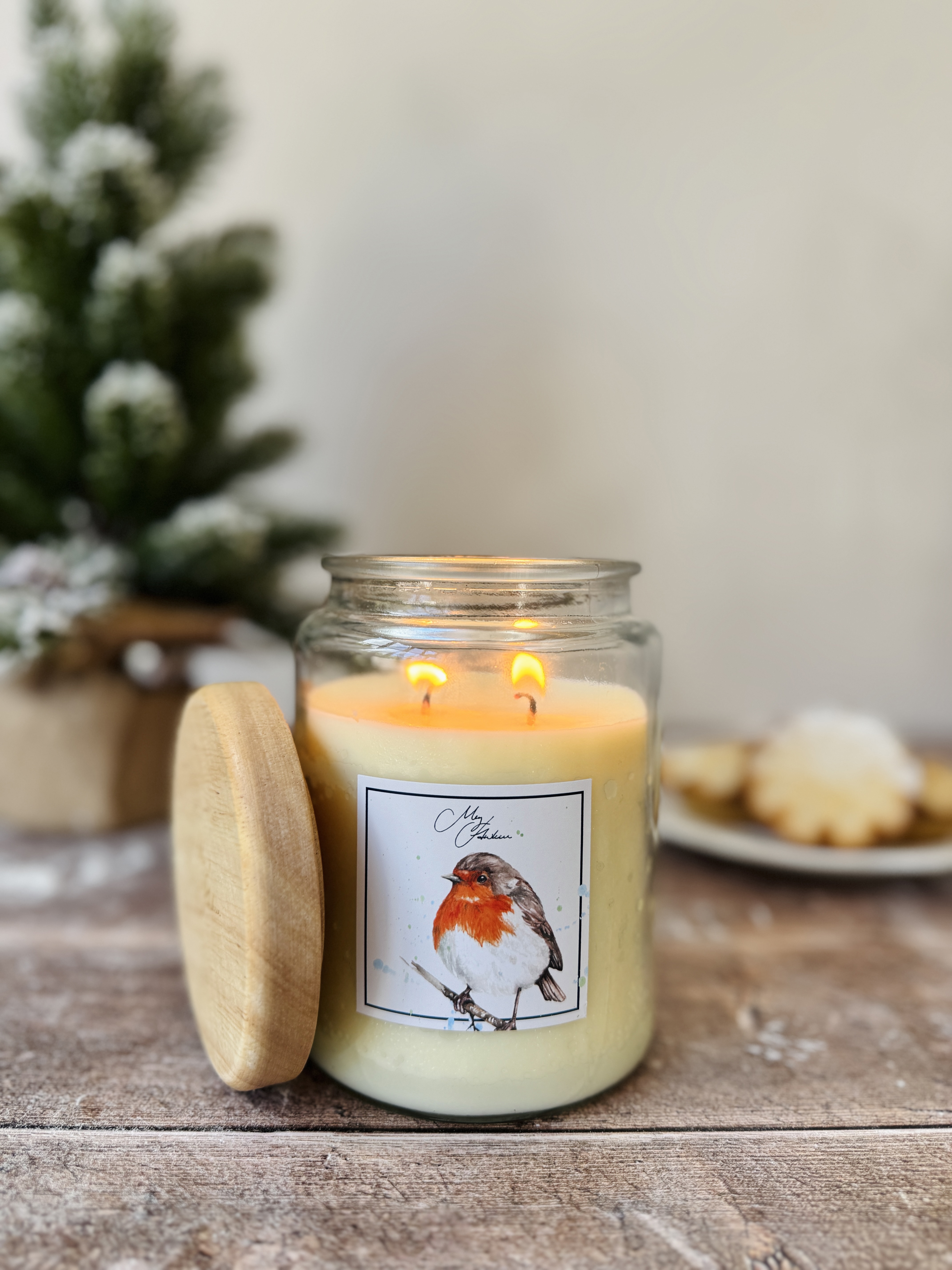 Infuse your home with the crisp, uplifting scent of Lime, Basil & Mandarin. Housed in a sleek glass jar with a natural wooden lid, this 500g candle is as elegant as it is aromatic. Featuring a signature Meg Hawkins robin illustration, it brings a touch of artistry and freshness to any space.