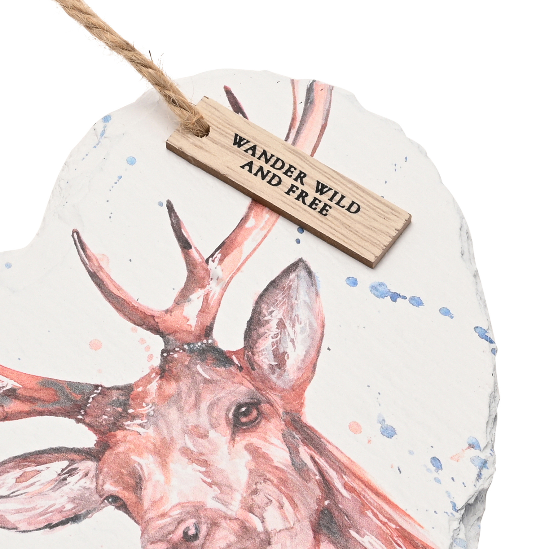 • Slate hanging heart featuring a stag design by Meg Hawkins