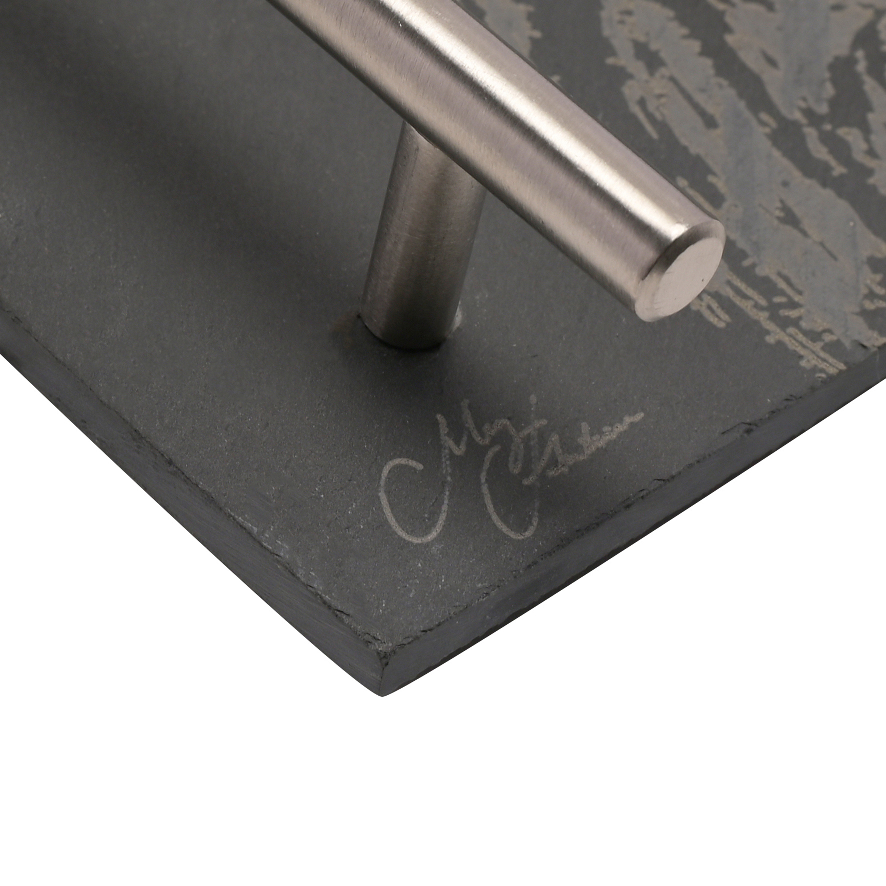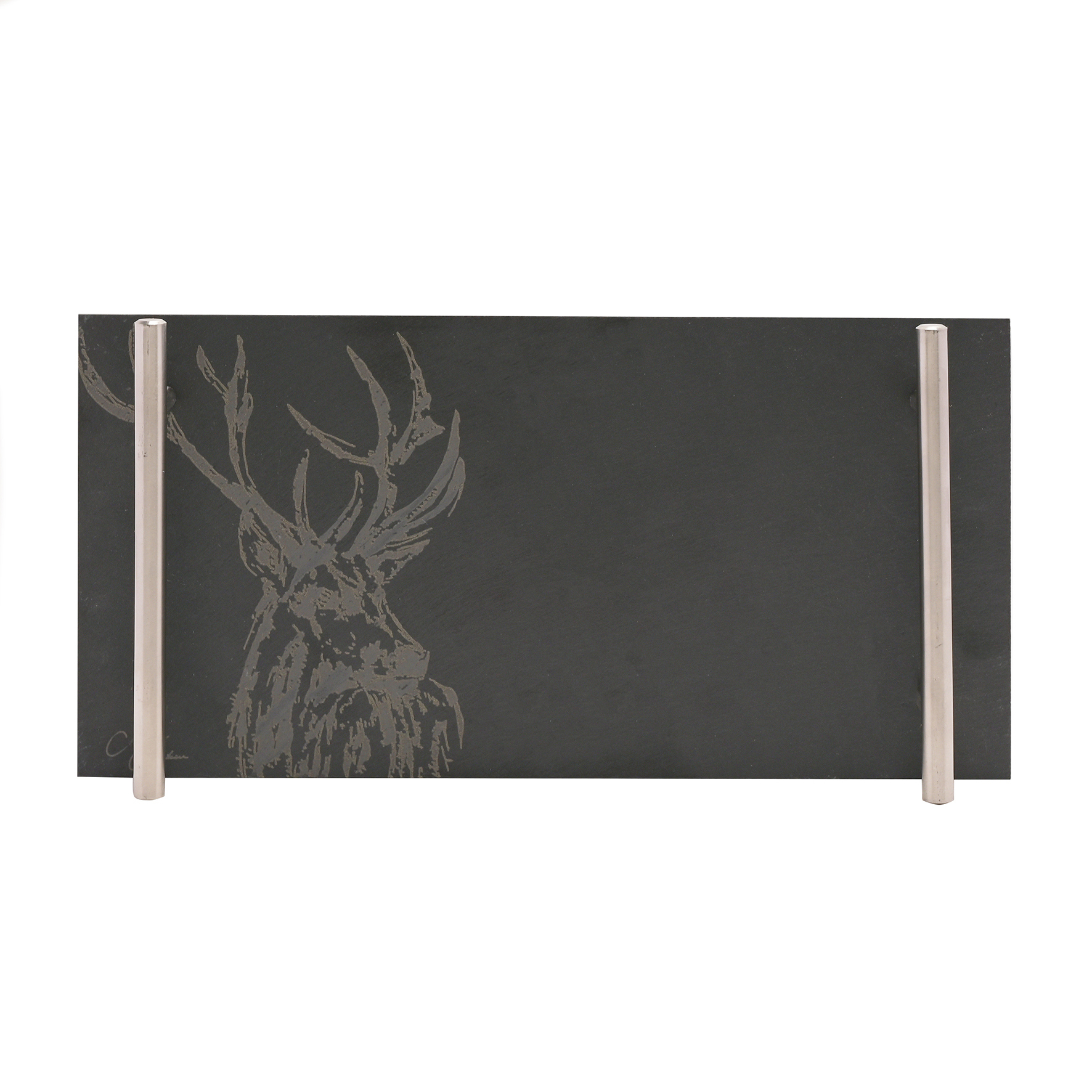 The rectangular, black slate board features a matt finish and silver metal handles on either side. It is finished by a printed stag illustration and Meg Hawkins signature.