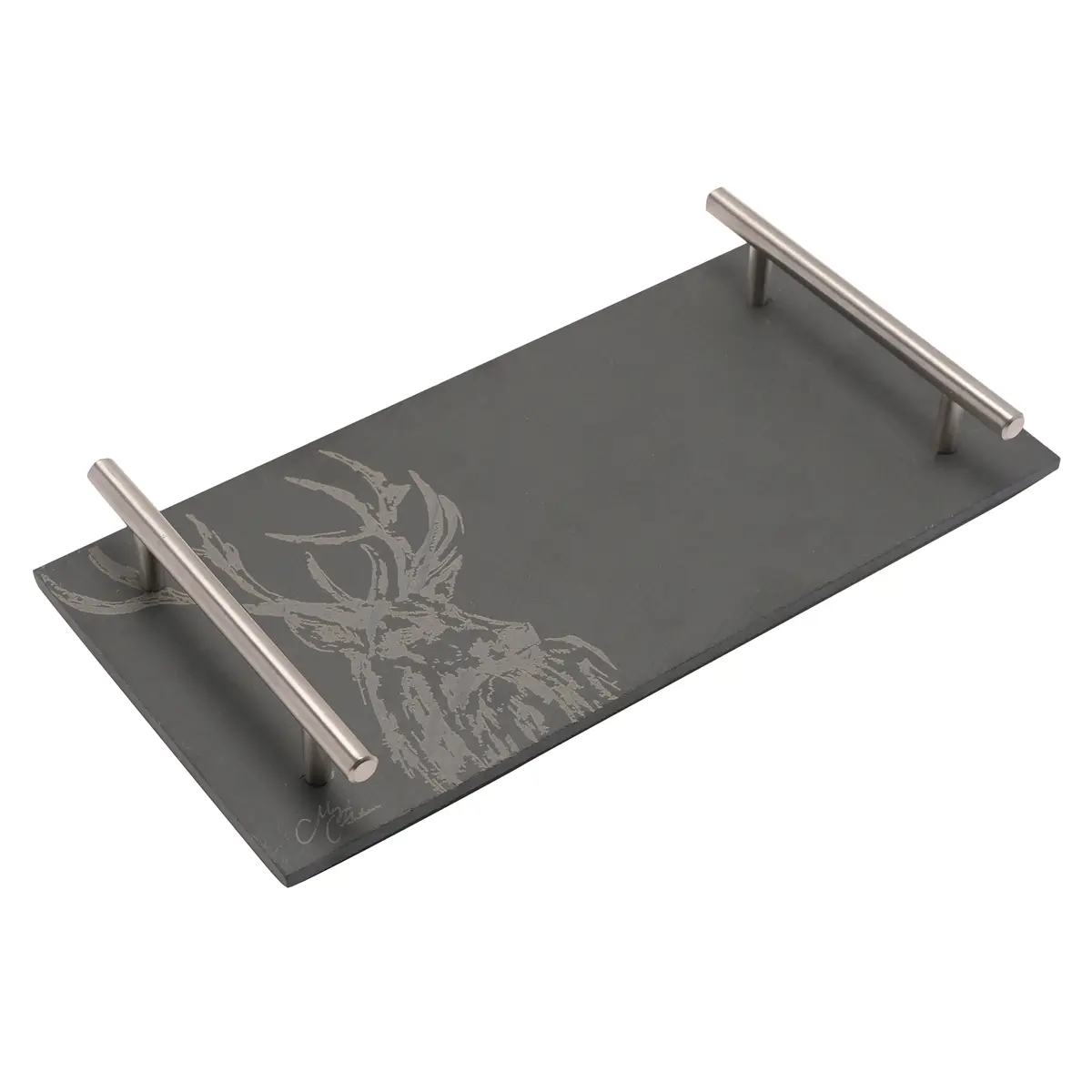 The rectangular, black slate board features a matt finish and silver metal handles on either side. It is finished by a printed stag illustration and Meg Hawkins signature.