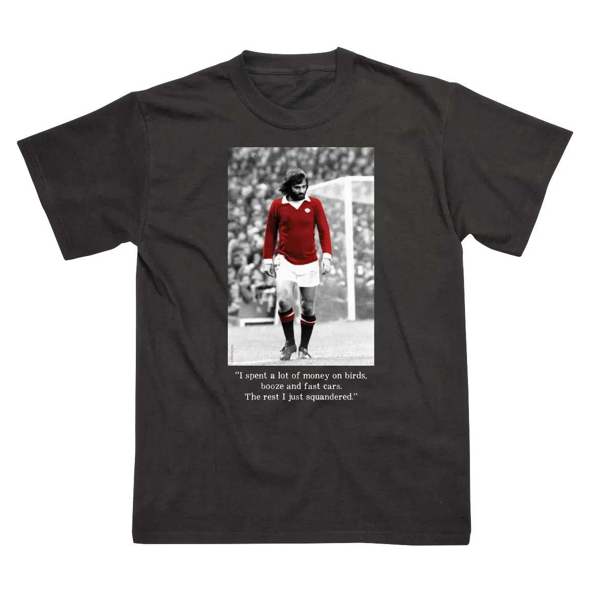 The George Best T-Shirt celebrates the Manchester United legend with his classic, cheeky quote about life’s indulgences "I spent a lot of money on booze, birds and fast cars. The rest I just squandered". Made from 100% cotton, this tee is soft, durable, and machine-washable at 30°C. Available in sizes S to XXL, and for longevity, avoid ironing over the print.