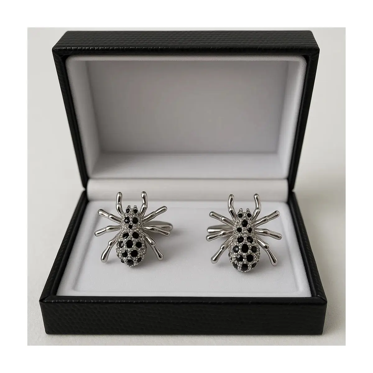 Add a daring edge to your formal attire with these intricately designed spider cufflinks. Crafted with precision, each cufflink features a detailed spider silhouette adorned with shimmering black accents, creating a look that’s both sophisticated and bold.