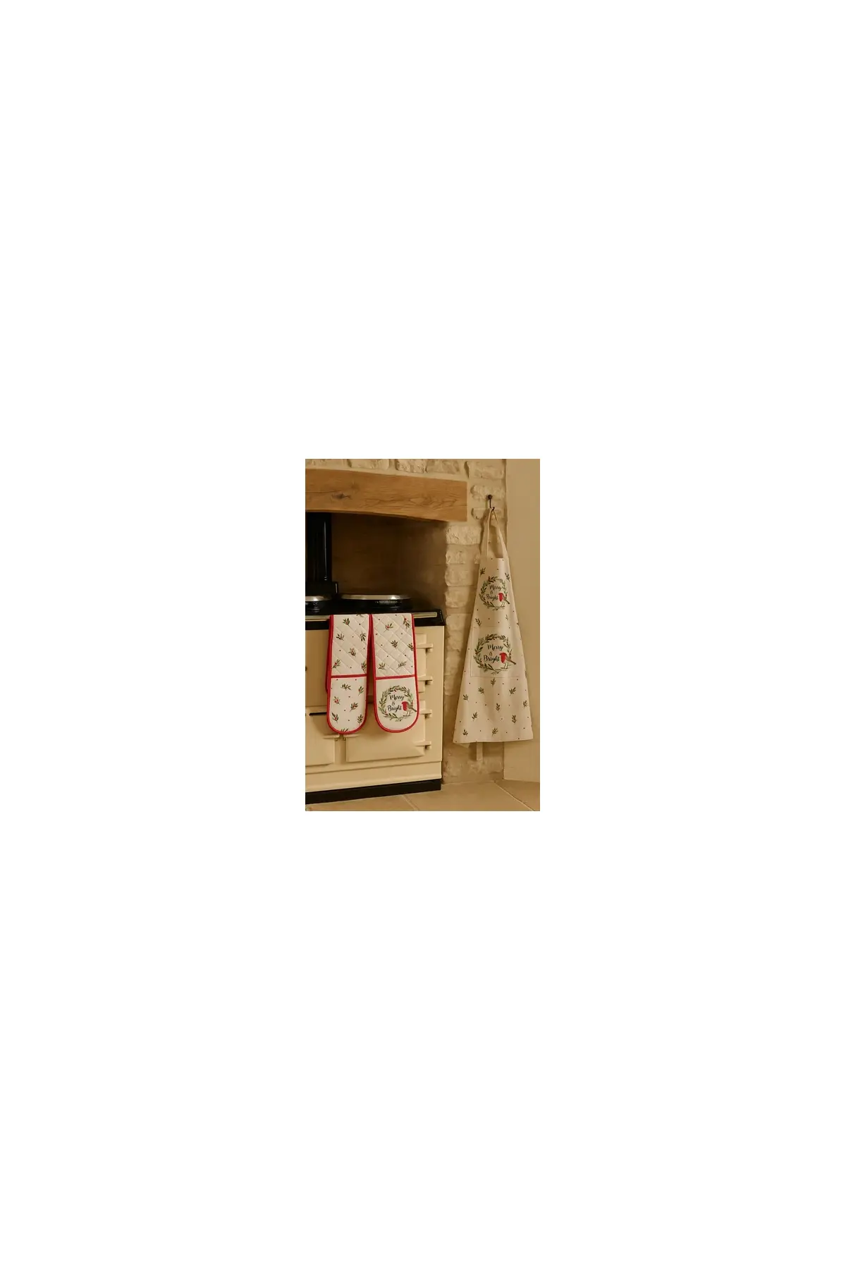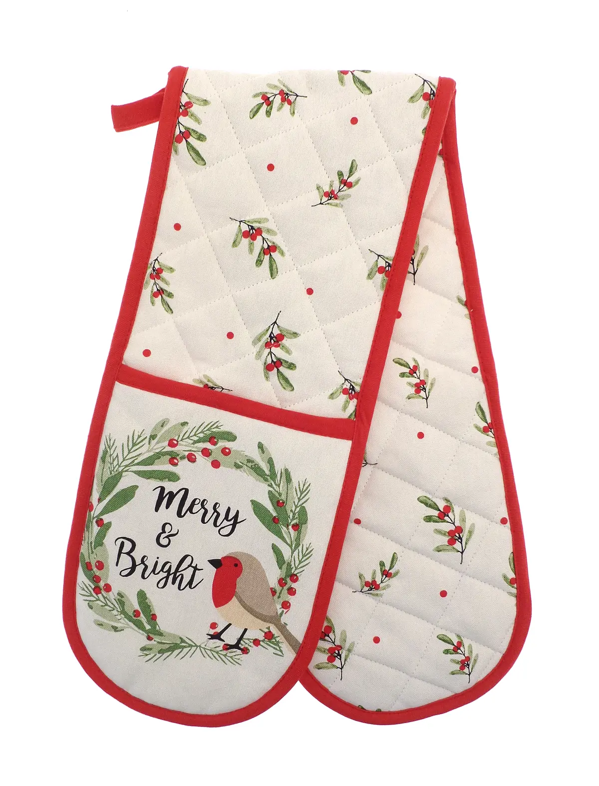 Add a cheerful touch to your kitchen with these Merry and Bright double oven gloves, featuring a charming festive robin design. Perfect for bringing a bit of seasonal joy to your cooking and baking, they offer both style and practicality. The padded design ensures safe handling of hot dishes, while the playful pattern makes them a lovely addition to your Christmas kitchen décor.