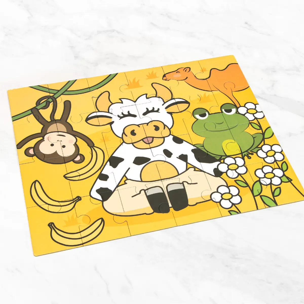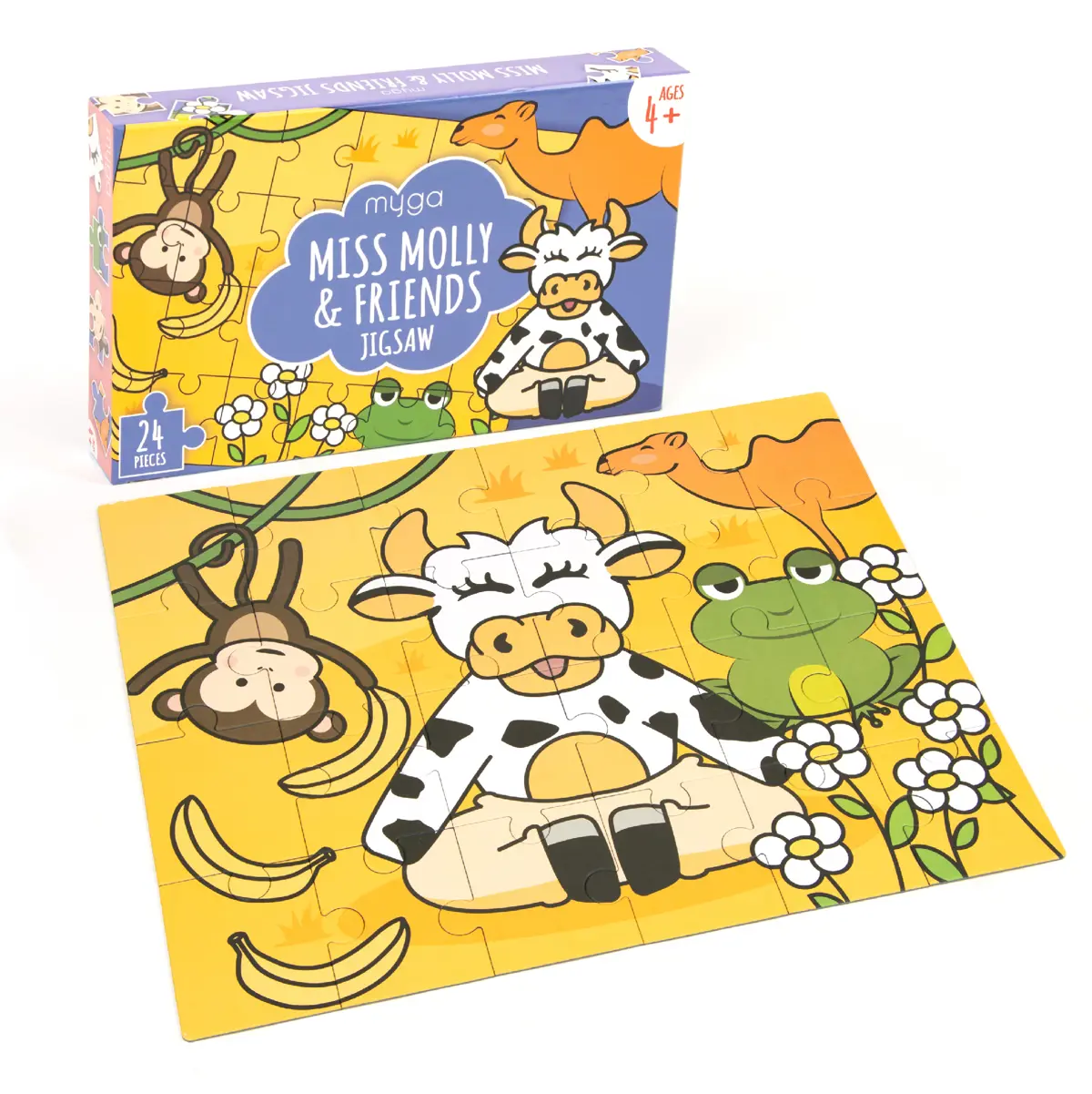 The cute jigsaw puzzle ""Miss Molly & friends” from Myga is inspired by Molly, the moo-ditating yoga cow, and especially loved by little children who adore animals. It has 24 pieces, a child-friendly design and it shows Molly the cow in a meditative pose, a cheeky monkey hanging from a tree, a relaxed camel and chilled frog as well as bananas and flowers. All 4 animals are well known kids yoga poses.