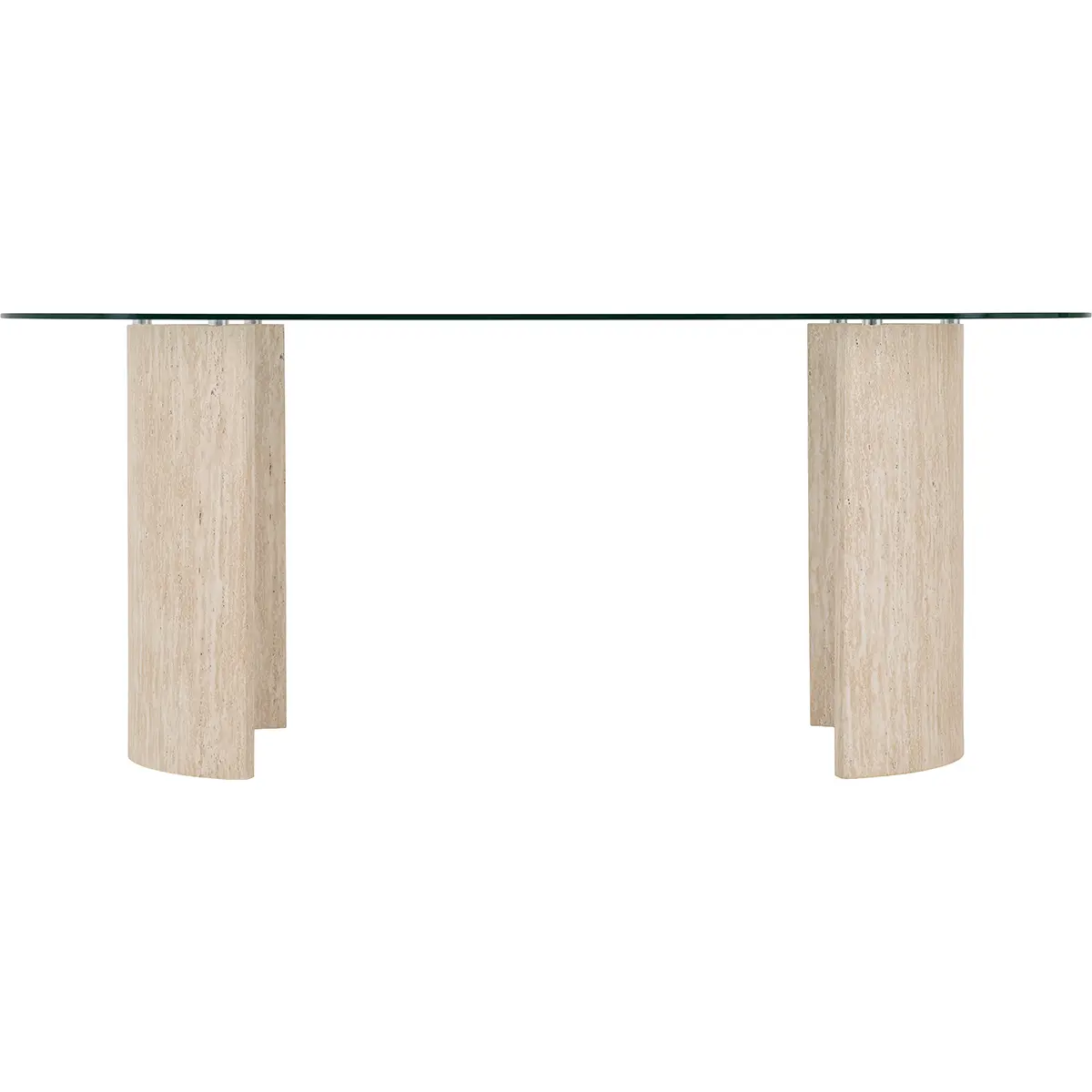 Contemporary Design: Features a clear tempered glass top with softly rounded edges for a refined, airy look that enhances any interior. Statement Base: Supported by two half-cylindrical pedestal legs in a natural stone-effect finish, adding texture and visual interest. Generous Surface Area: Perfect for hosting family dinners or entertaining guests. Durable Construction: Crafted from high-quality materials for stability and long-lasting use.