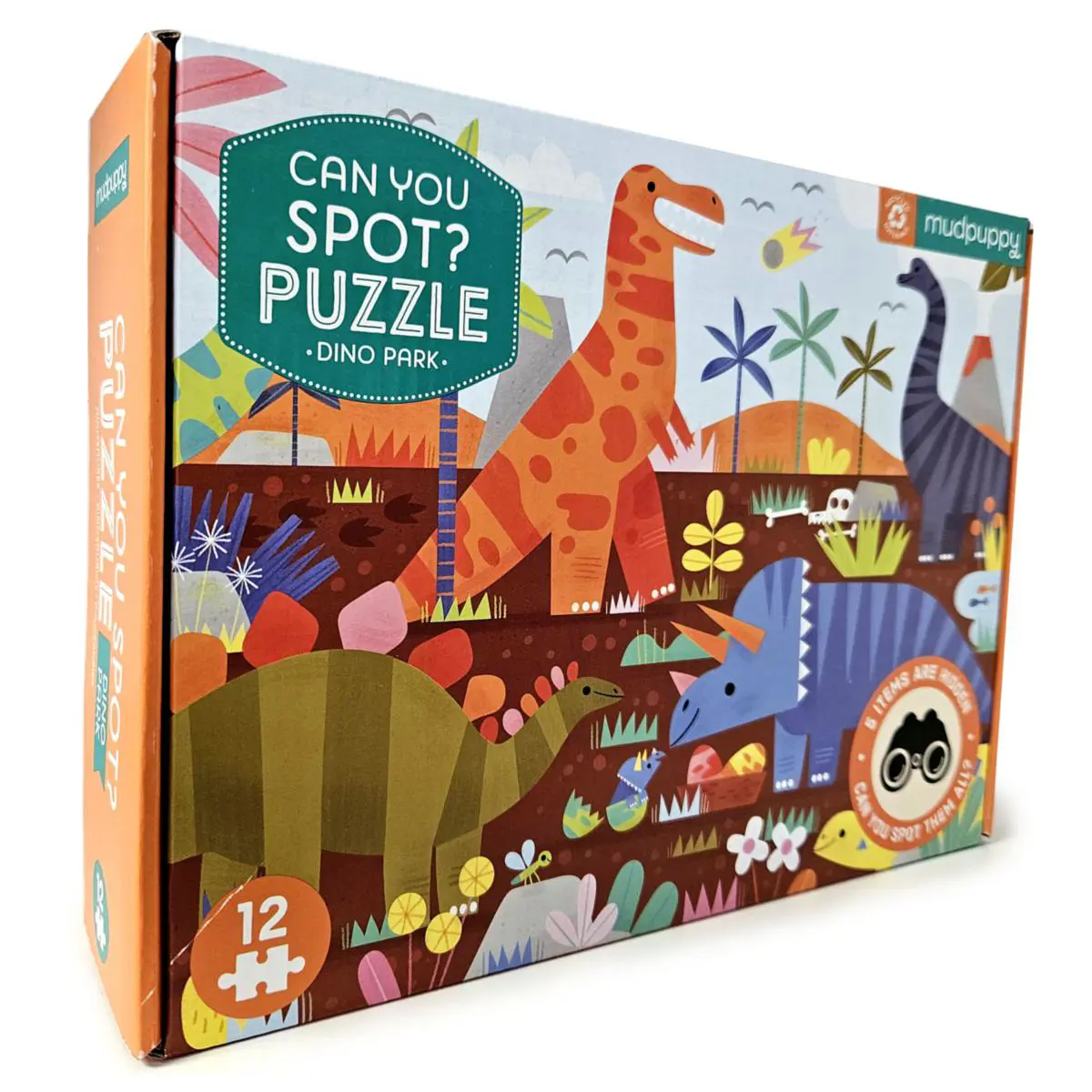 Mudpuppy’s Dino Park Can You Spot? Puzzle brings your favourite dinosaurs to life with double the fun. Children can first enjoy piecing together this colourful 12-piece puzzle featuring beloved dinosaurs like the T-Rex, Triceratops and Stegosaurus. Once complete, they can put their observation skills to the test by finding five hidden images within the puzzle. Can you spot them all?