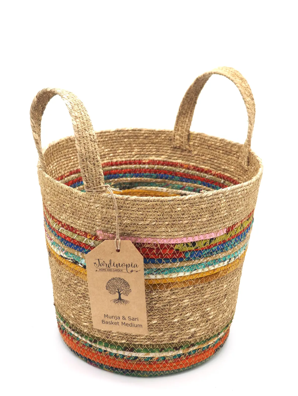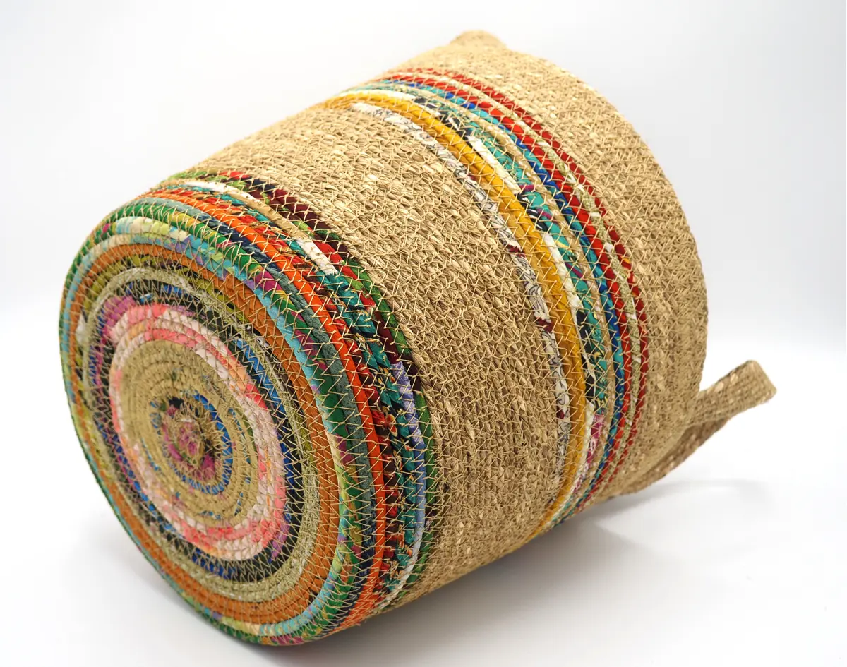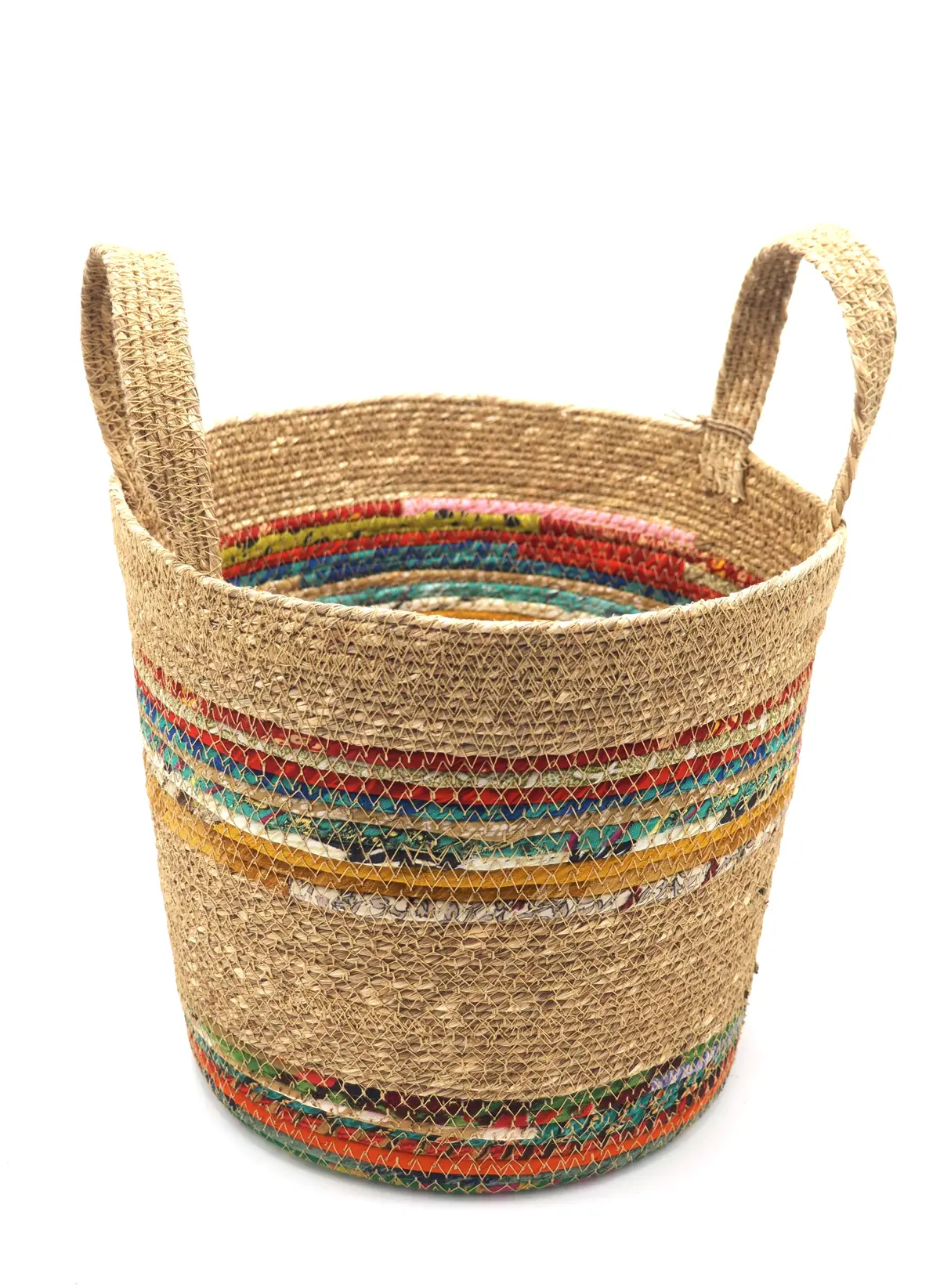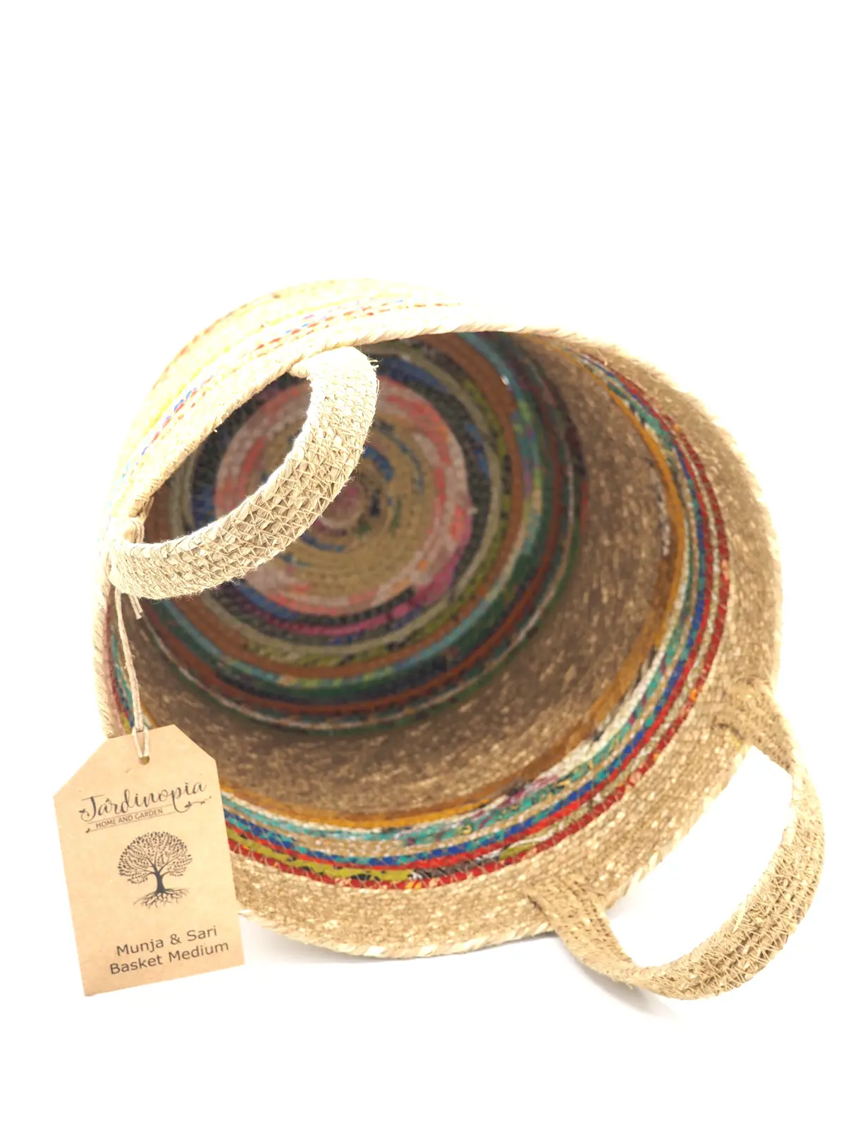 Munja And Reclaimed Sari Fabric Round Basket 25 x 25 x 34 cm