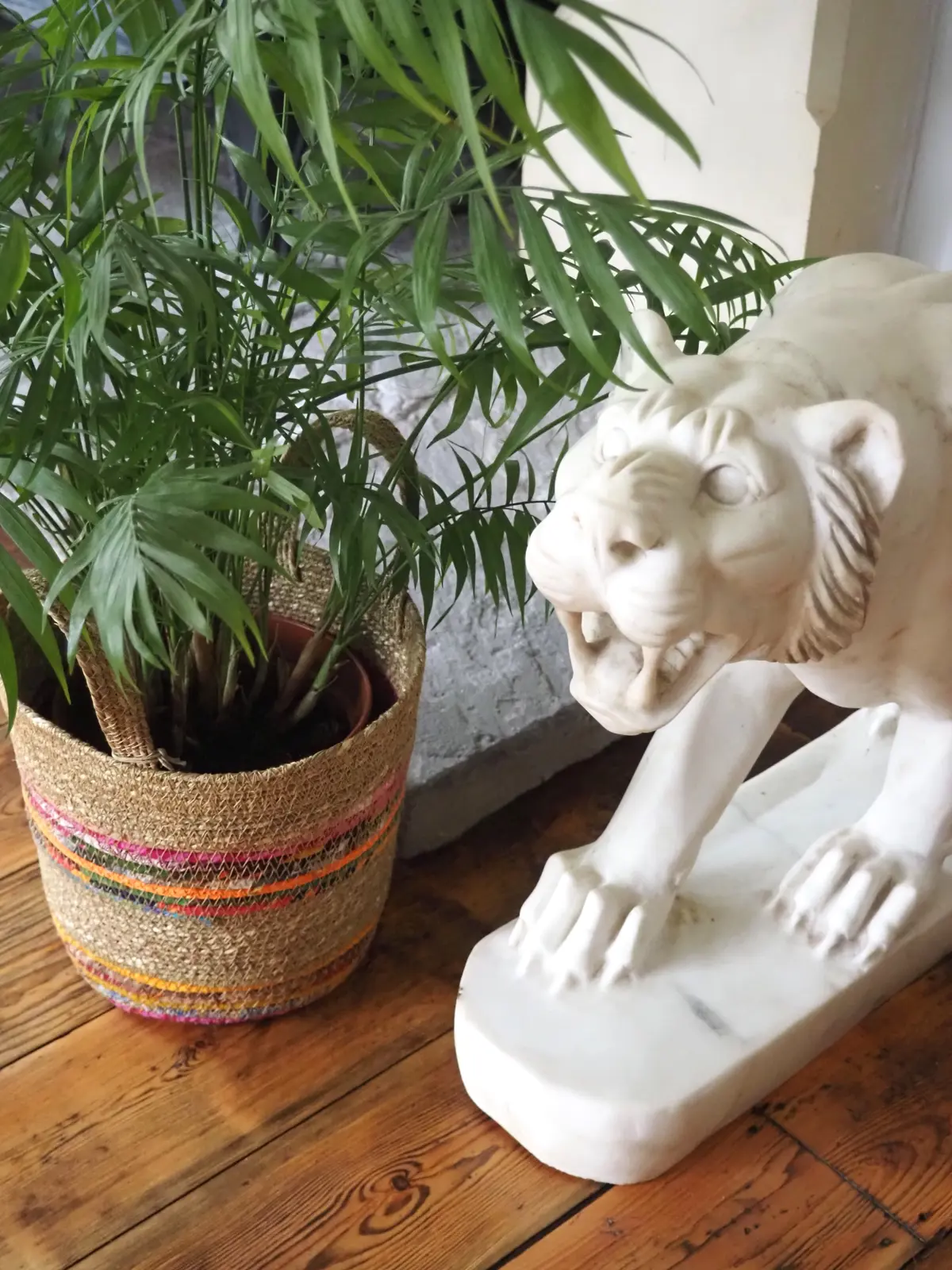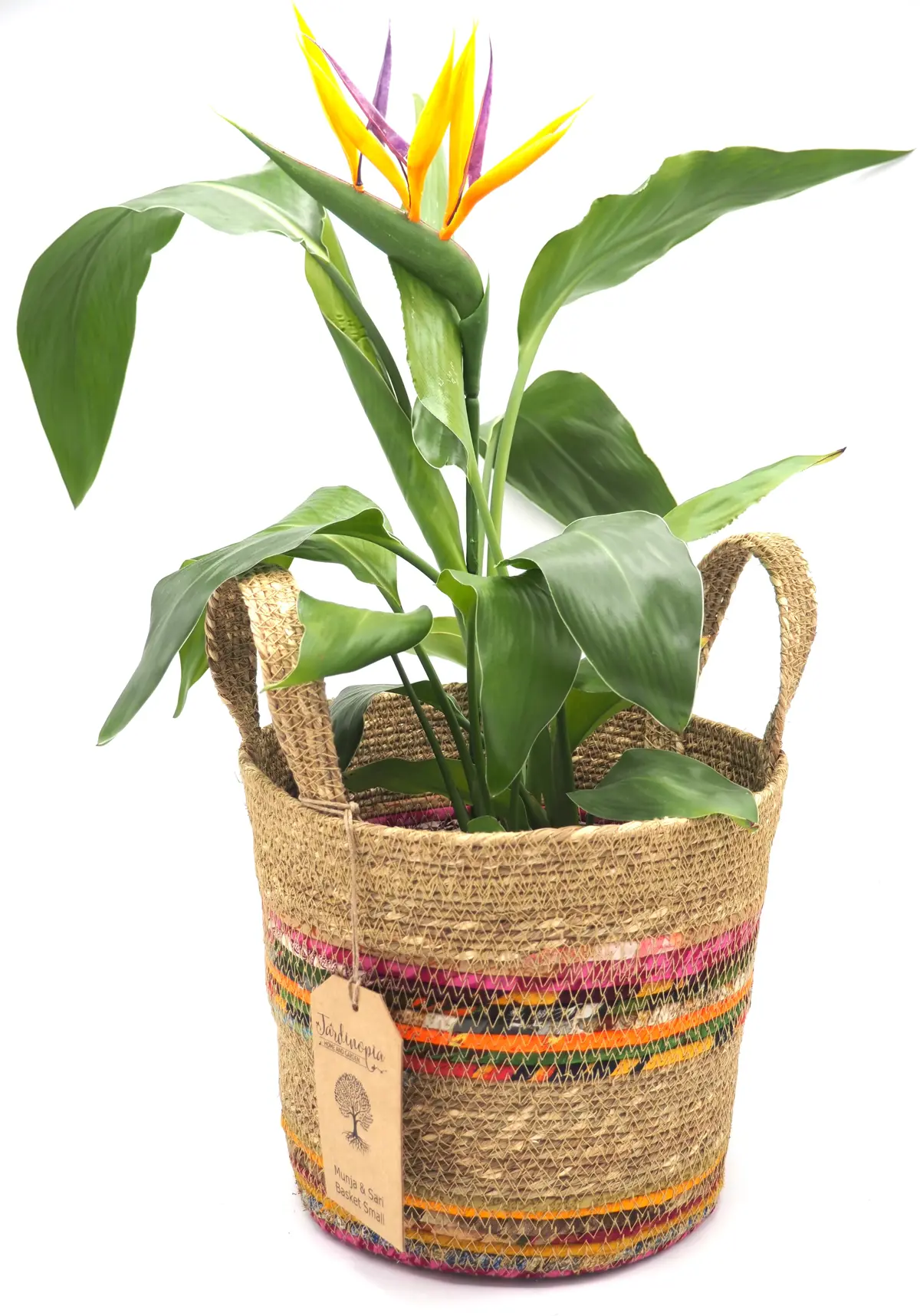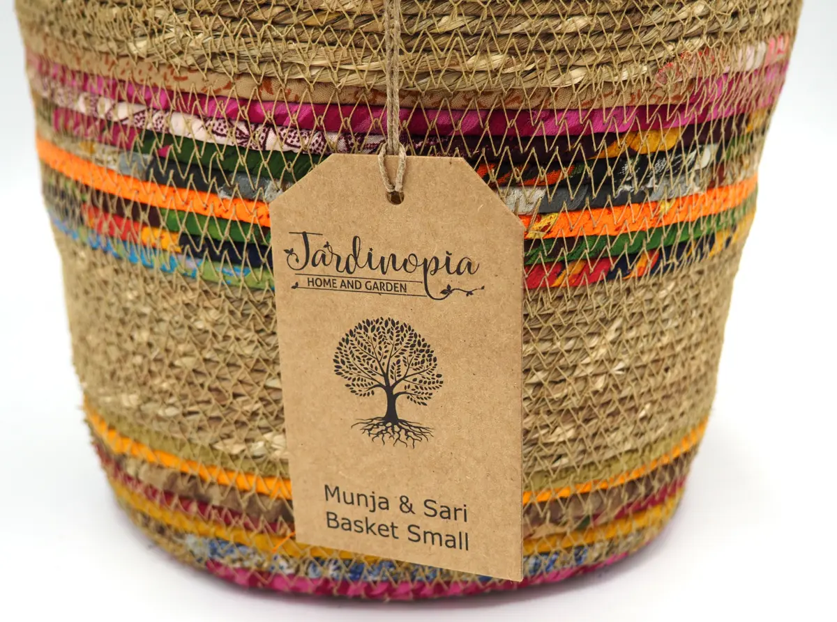 Brighten up your living space with this Munja And Reclaimed Sari Fabric Plant Pot Cover from Jardinopia. This plant pot cover has been fashioned in India using reclaimed sari fabric from factory offcuts that have been gathered and washed, and then artfully crafted together with sustainably sourced munja. It has strong carrying handles, and can also be used as a storage container or waste paper bin. Size - Length 25cm x Width 25 cm x Height 34 cm