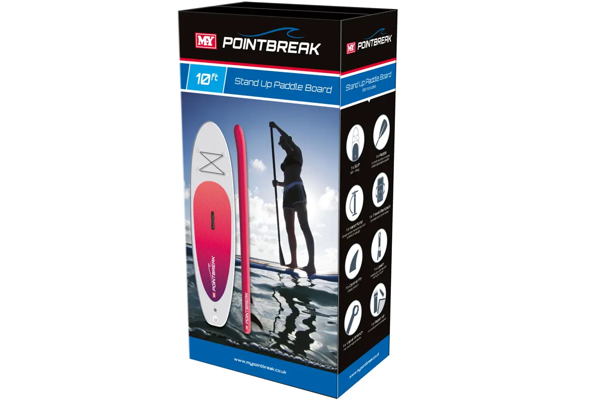 This set includes; M.Y Point Break Paddle Board, 3 Shaft Aluminium Paddle, Single Action Hand Pump, Backpack/Carry Case, Central Fin, Leash, Valve Wrench, Repair Kit, detailed instruction manual.