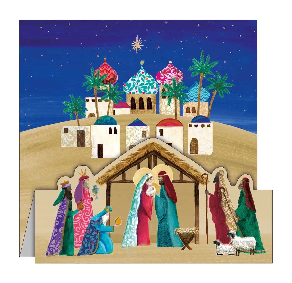Celebrate the heart of Christmas with our Nativity Scene Charity Christmas Cards. This beautifully illustrated design features Mary, Joseph, and baby Jesus in the stable, surrounded by the Three Wise Men bearing gifts beneath the shining Star of Bethlehem. In the background, a vibrant depiction of Bethlehem glows under a deep midnight sky, filled with rich colour and intricate detail.