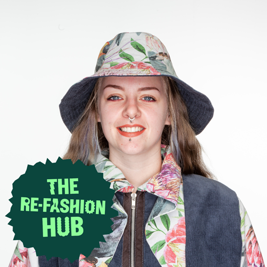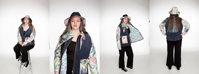 This unique jacket features an exaggerated collar that really reflects Olivia’s passion for more Avant Garde fashion. The bold floral patterns help ensure that this jacket stands out, bringing a splash of colour and an air of confidence to any outfit. Staying to the projects sustainable ethos, Olivia fashioned a matching reversible bucket hat using the remaining leftover fabric, making sure nothing was wasted, and the look was complete.