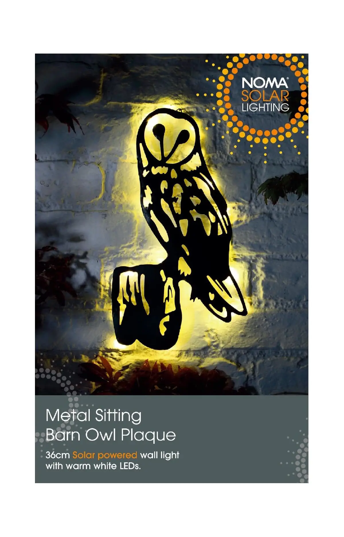 Brighten up your garden with the NOMA Solar Metal Garden Wall Light! Designed to bring a charming, warm ambiance to any outdoor space, this decorative metal plaque features a beautiful, nature-inspired cutout design. During the day, it absorbs sunlight to charge and, at dusk, automatically lights up to cast an enchanting glow on your patio, pathway, or flower beds.