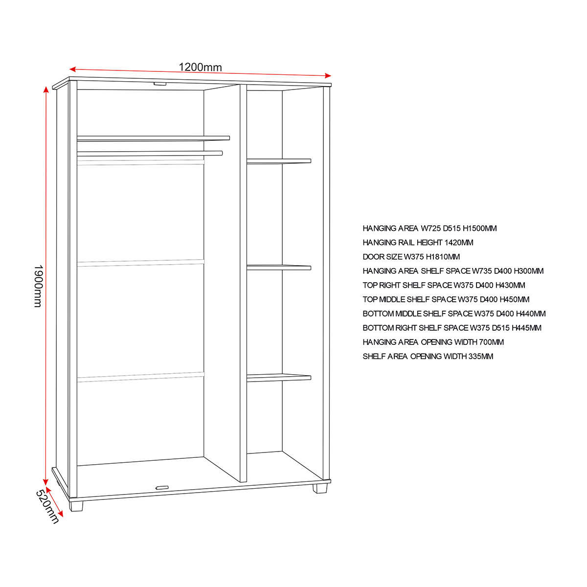 Assembled Dimensions: Width: 120 x Depth: 52 x Height: 190 (cm)