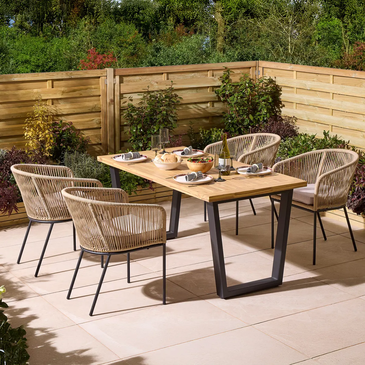 This five-piece set includes a spacious acacia hardwood table and four elegant dining chairs, each featuring a natural-toned rope weave over a sturdy dark grey steel frame. The warm wood tones of the tabletop contrast beautifully with the industrial-style legs and the calming, neutral shades of the rope and seat cushions, creating a modern yet inviting aesthetic.