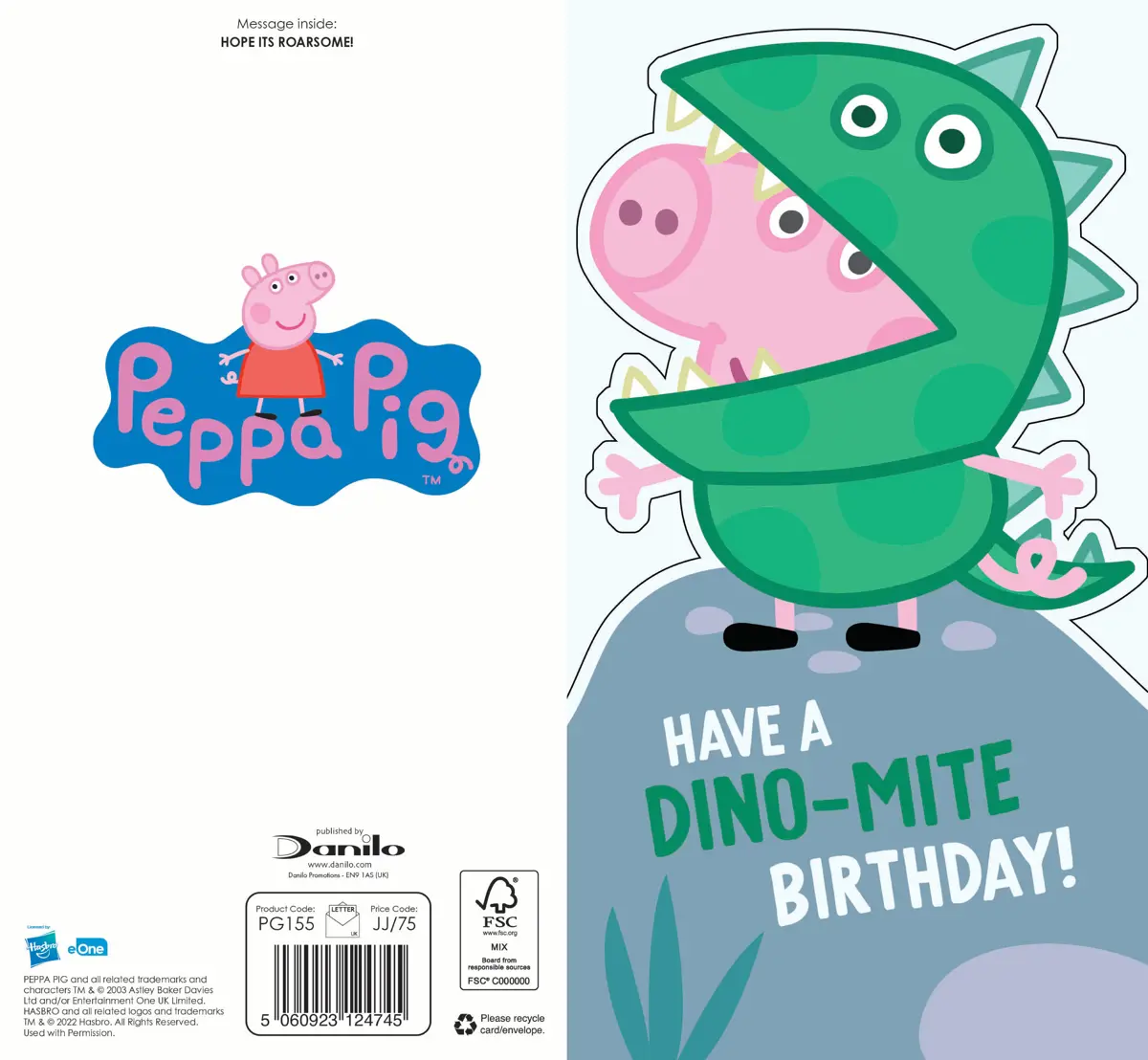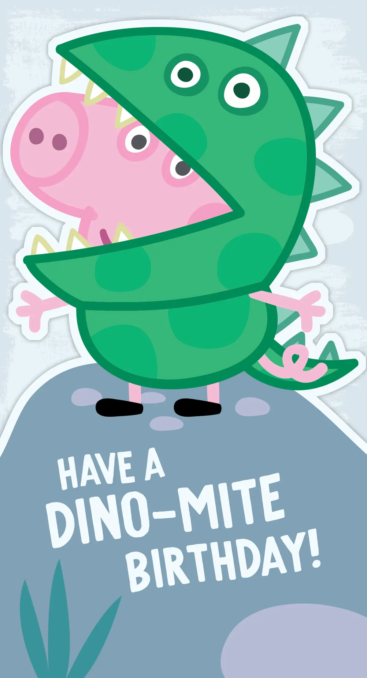 Make their special day extra dino mite with this Peppa Pig Children's George Birthday Card. Featuring George Pig dressed in an adorable green dinosaur costume, this bright and playful design is sure to delight little ones who love George Pig and all things roar some.