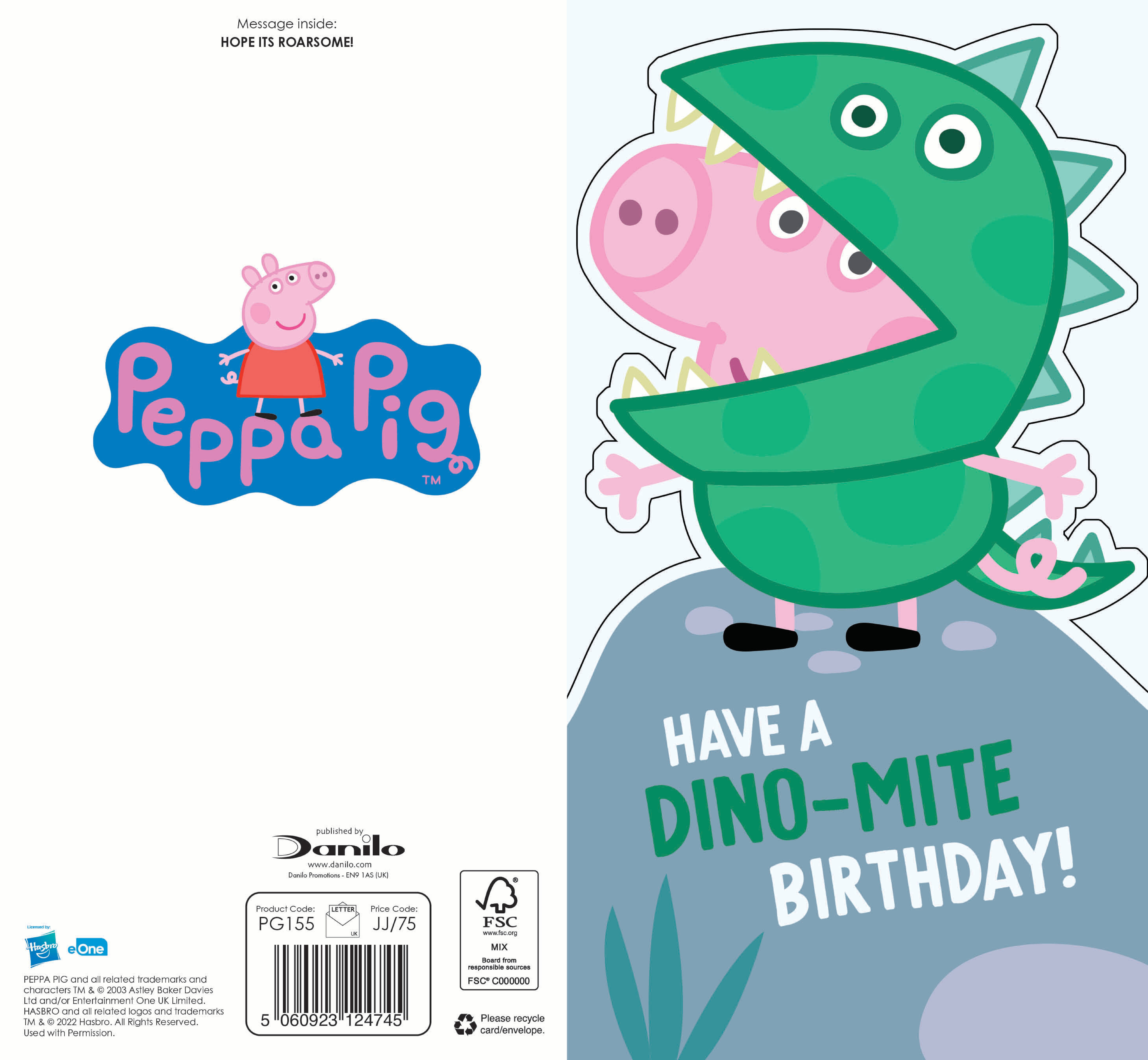 With the bold message “Have a Dino-Mite Birthday!”, this cheerful card brings plenty of fun before the celebrations even begin. Printed on 100% recyclable paper and supplied with an envelope, it is a lovely way to send birthday wishes to any young Peppa fan.