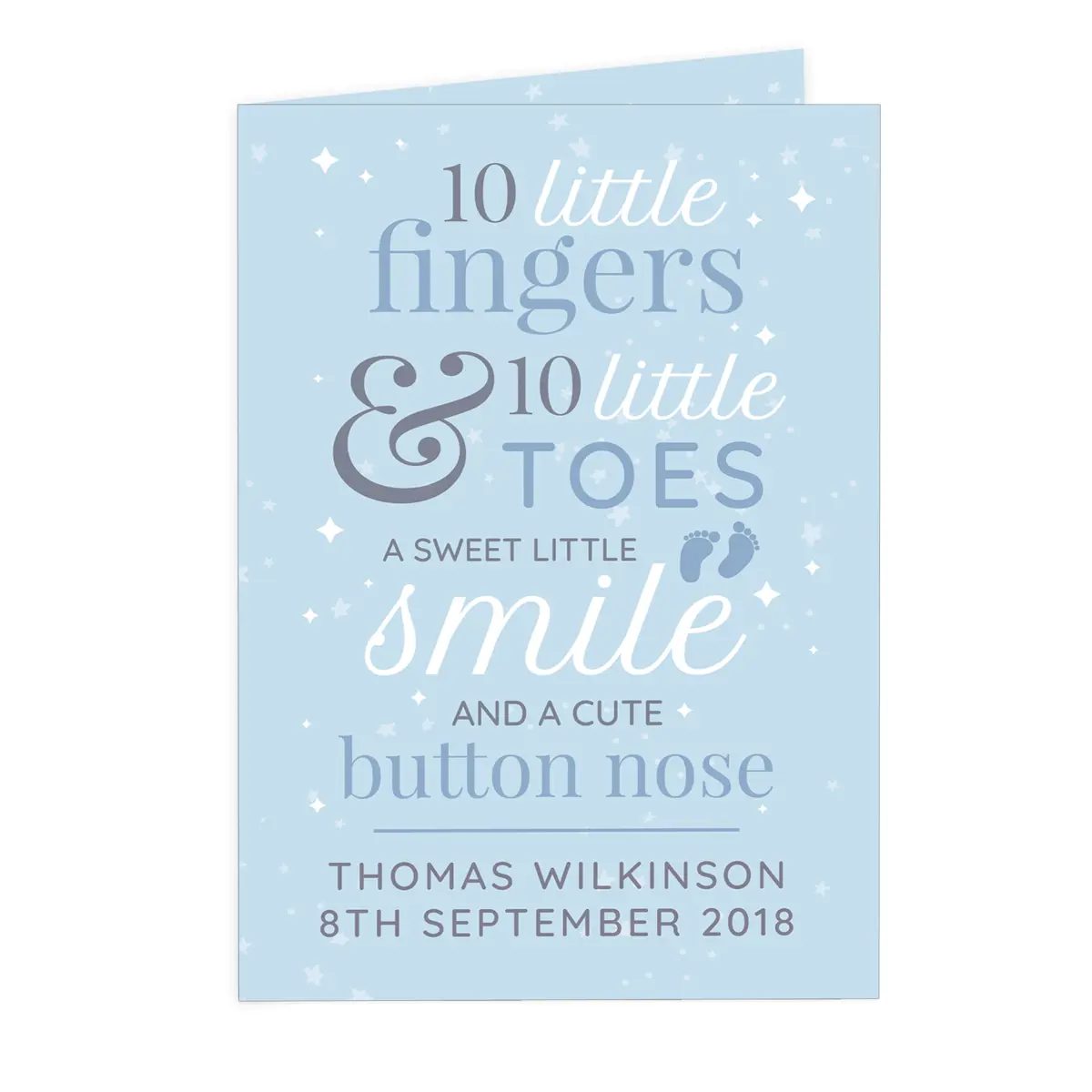Celebrate the arrival of a beautiful baby boy with this adorable personalised “10 Little Fingers” card. Featuring the sweet fixed poem “10 little fingers & 10 little toes. A sweet little smile and a cute button nose,” it’s the perfect way to share love and congratulations with proud new parents.