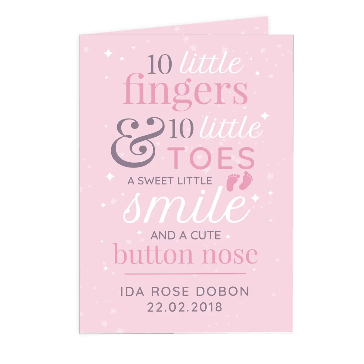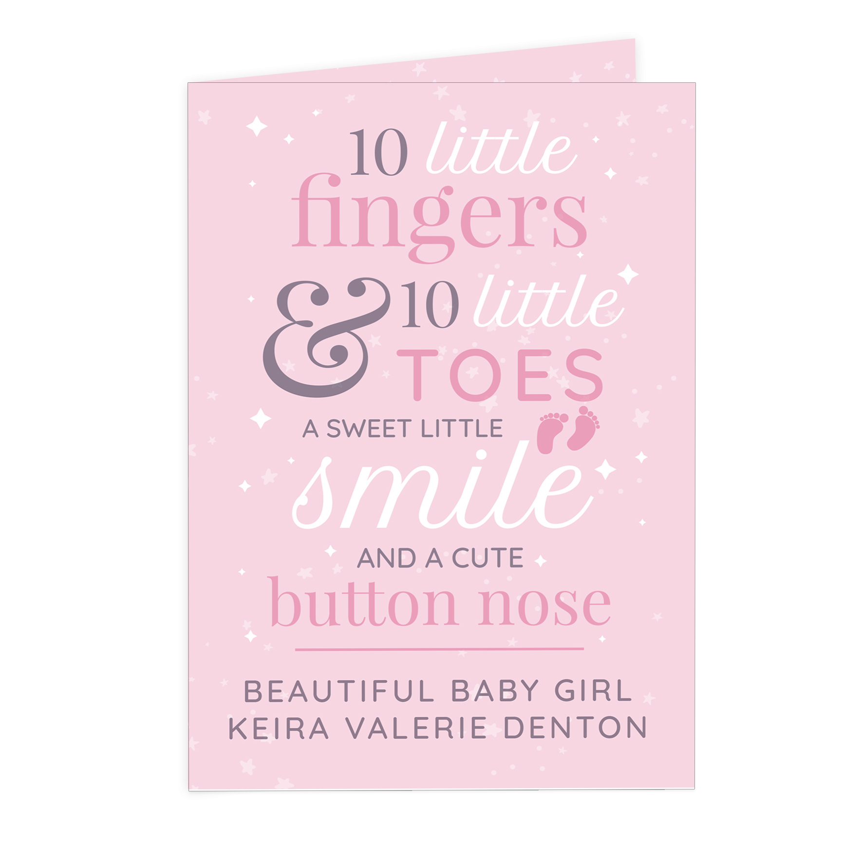 Welcome a beautiful baby girl into the world with this adorable personalised “10 Little Fingers” card. Featuring the sweet fixed poem “10 little fingers & 10 little toes. A sweet little smile and a cute button nose,” it’s a charming way to send love and congratulations to proud new parents.