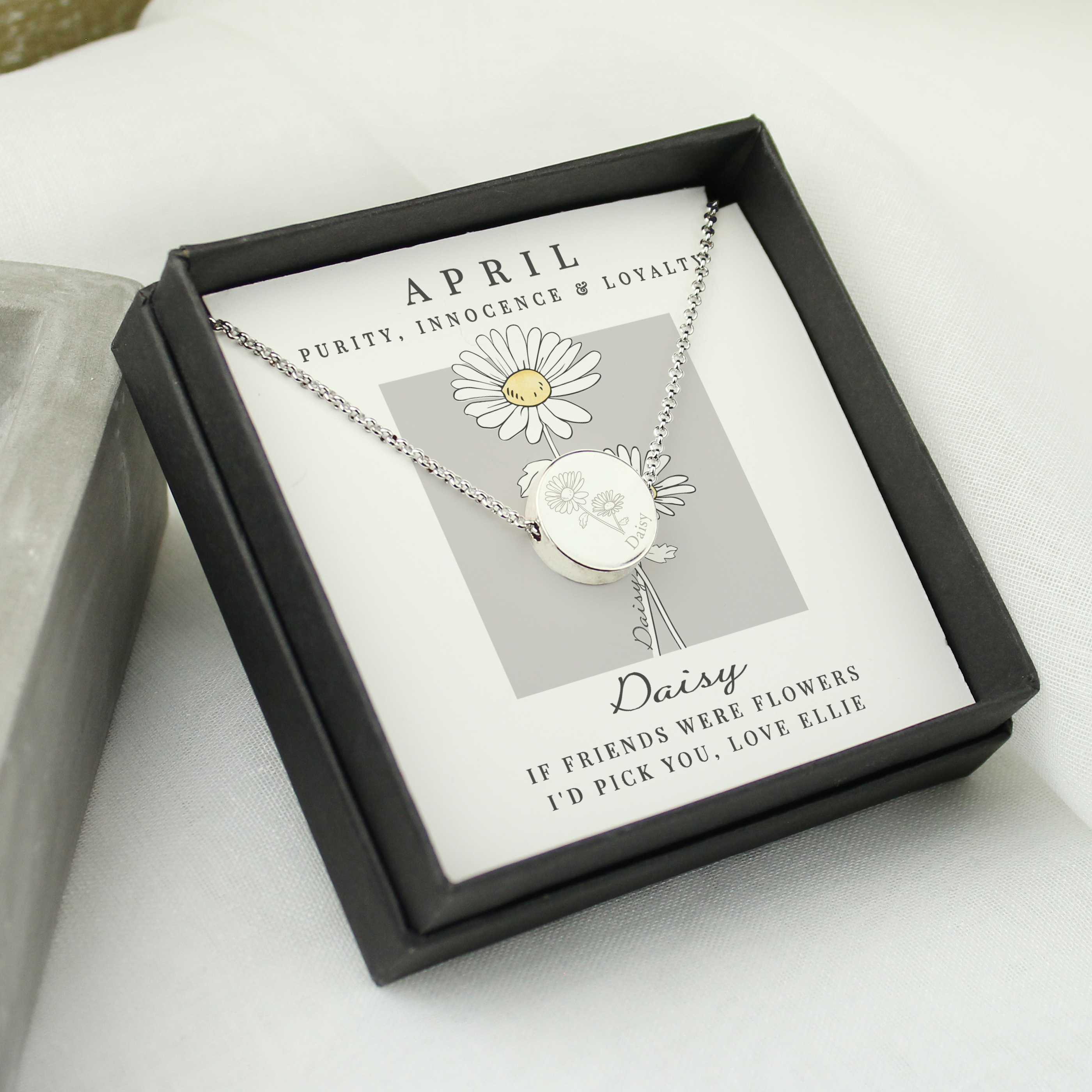 Featuring a colourful daisy illustration and the fixed text 'APRIL - PURITY, INNOCENCE & LOYALTY', you can make this gift extra special by adding a personal message as below