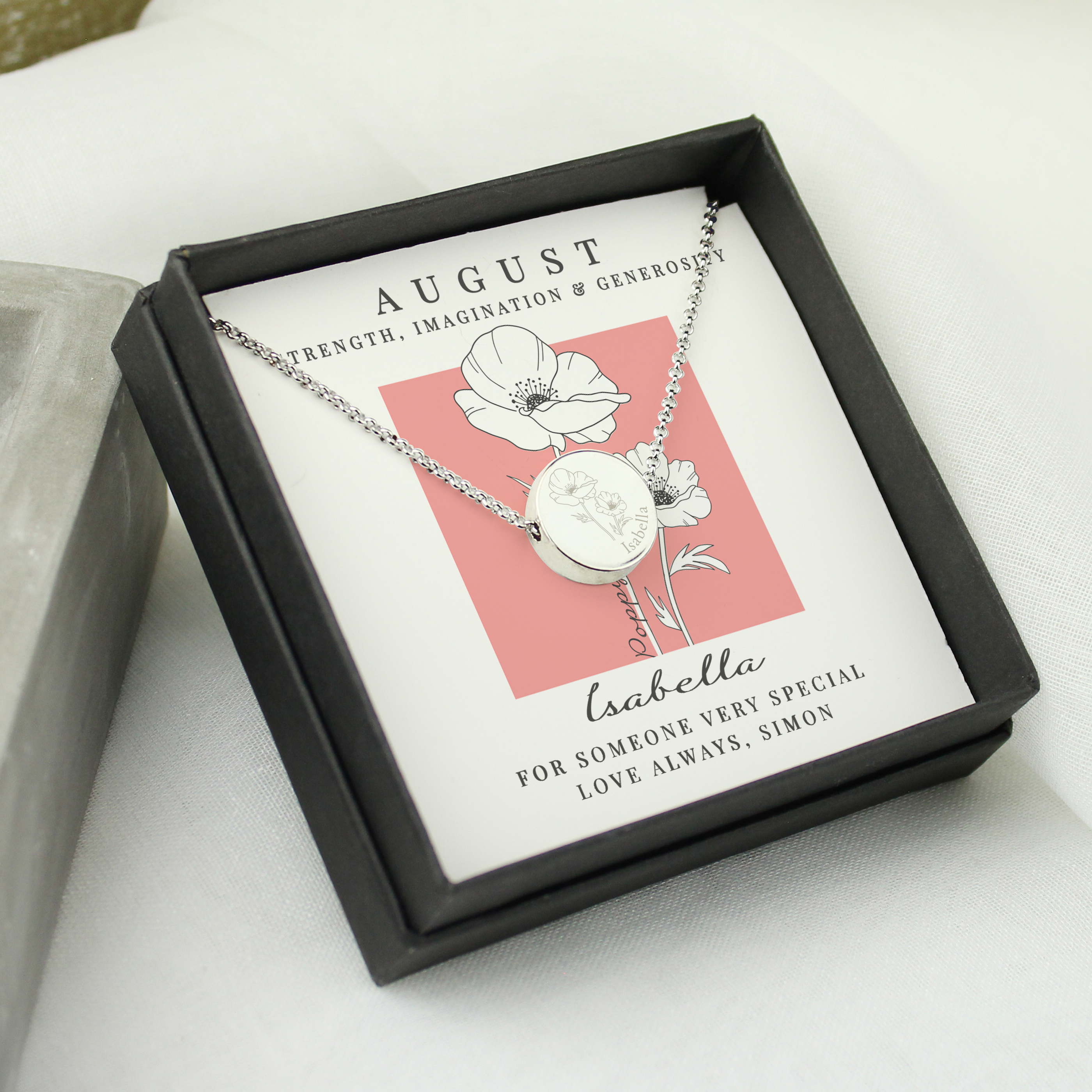 Featuring a colourful poppy illustration and the fixed text 'AUGUST - STRENGTH, IMAGINATION & GENEROSITY', you can make this gift extra special by adding a personal message as below