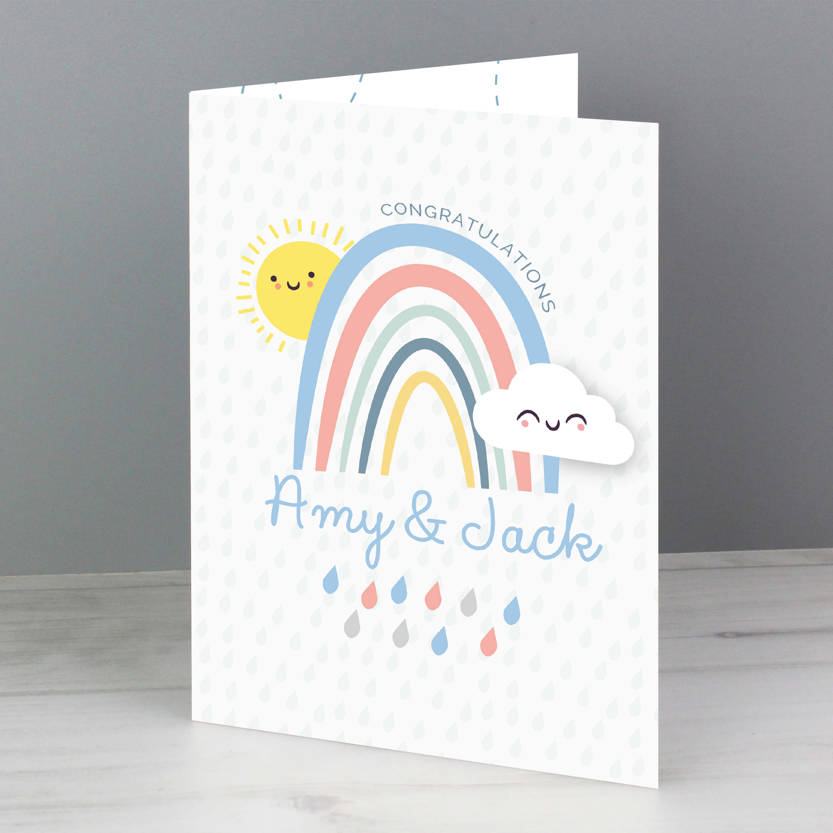 Welcome the joy of a new arrival with this delightful personalised card, perfect for baby showers, maternity leave, or celebrating the birth of a little one. Featuring a sweet rainbow, sun and cloud design in soft neutral colours, it is a thoughtful choice whether the baby’s gender is known or a lovely surprise.