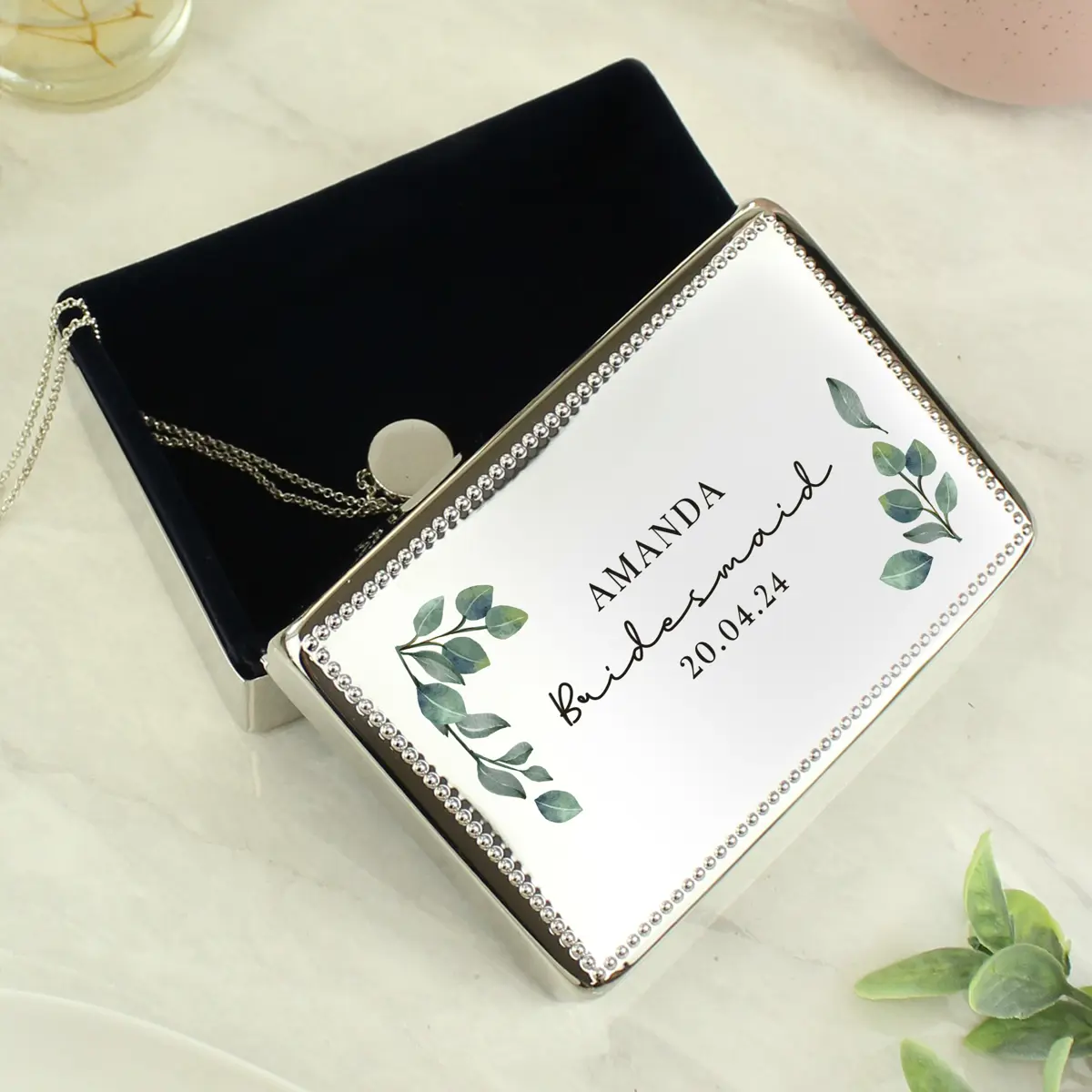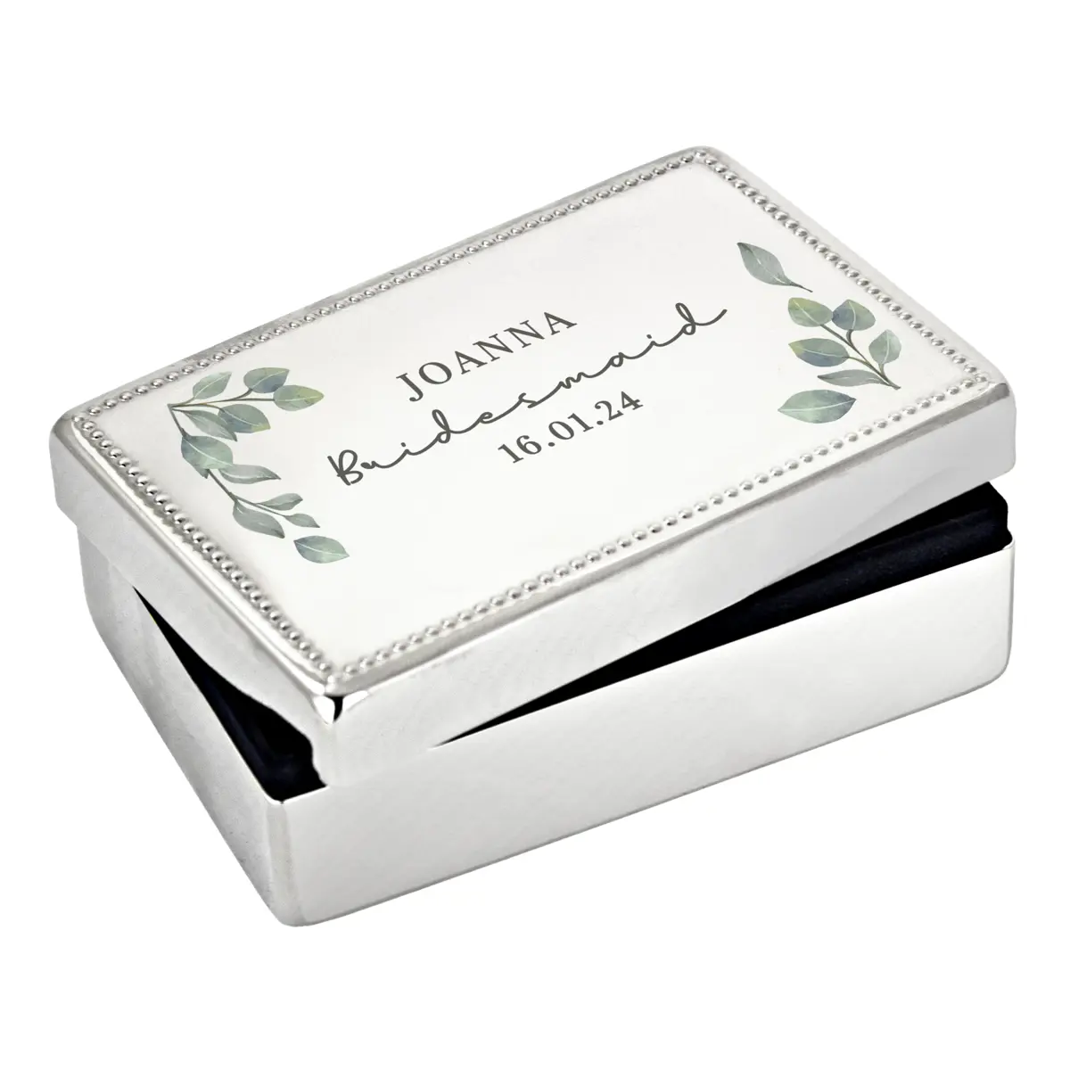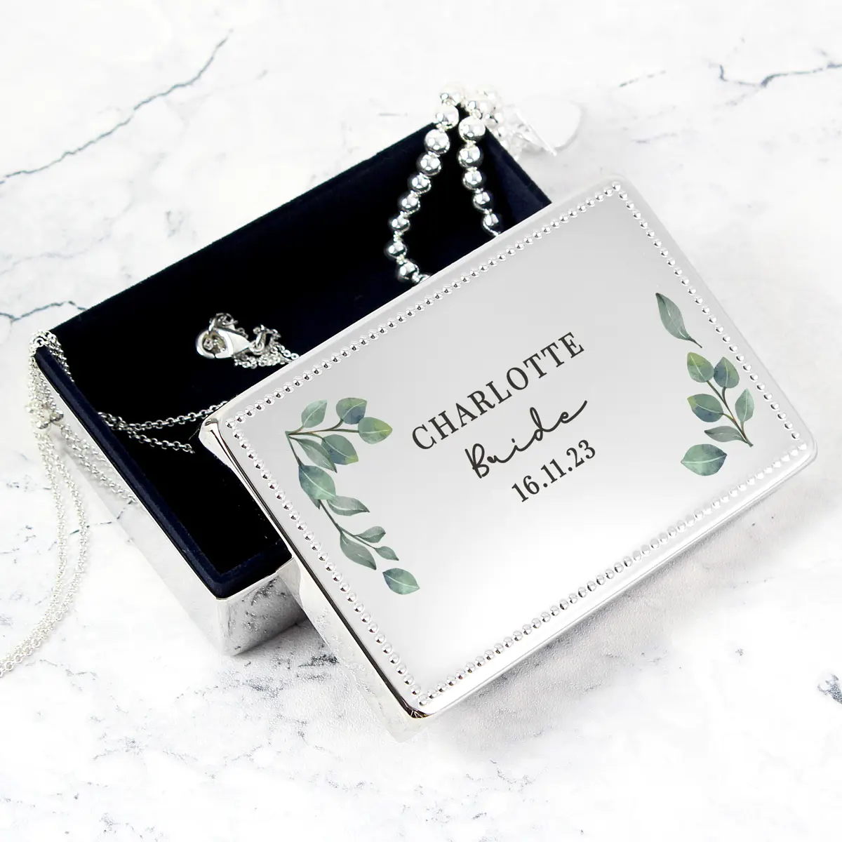 The jewellery box can be personalised with the following