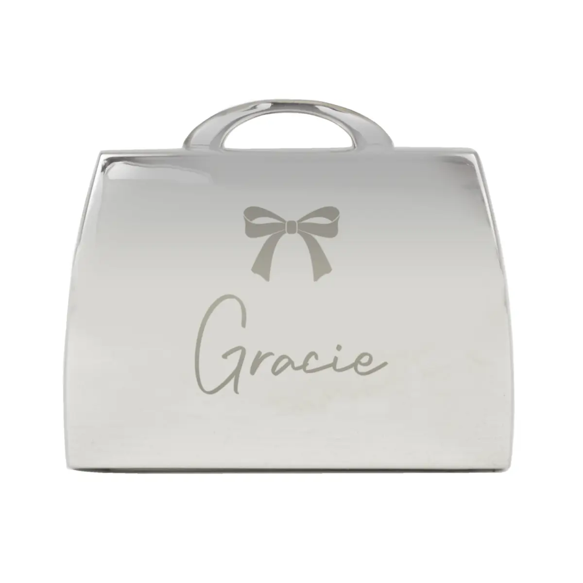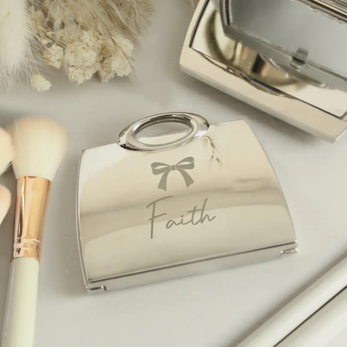 Add a little sparkle to their handbag with this Personalised Bow Handbag Compact Mirror. Shaped like a stylish handbag and finished with a sweet bow design, it is a thoughtful treat that brings a touch of everyday luxury to getting ready on the go.
