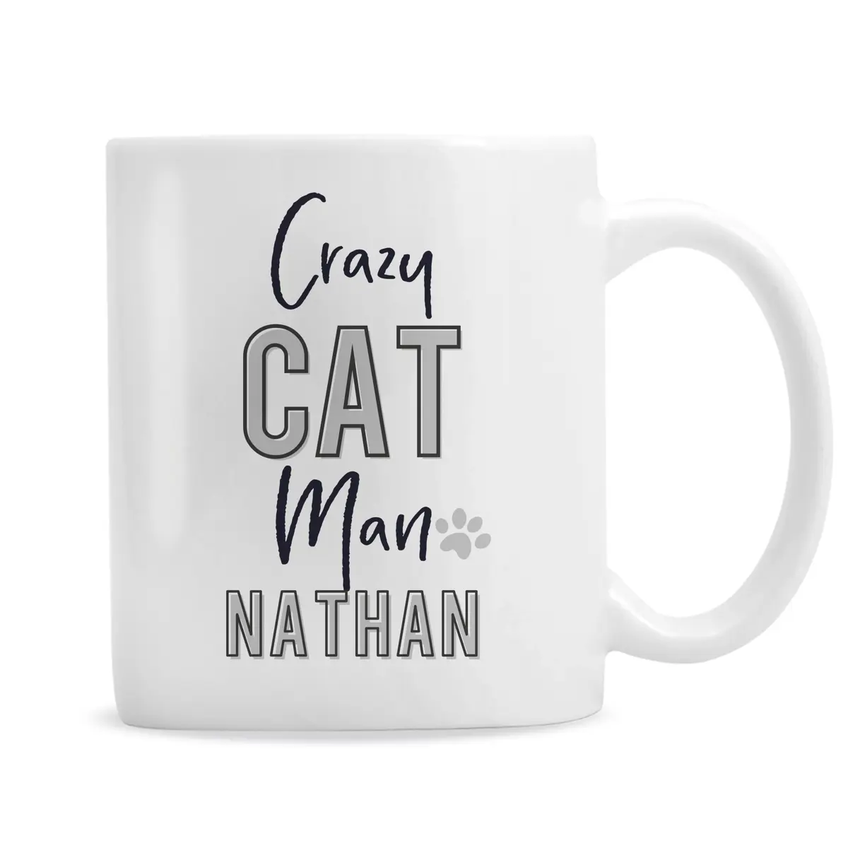 This cute personalised mug features the text ""Crazy Cat Man"" to the front, high praise for a man that loves their feline friend!