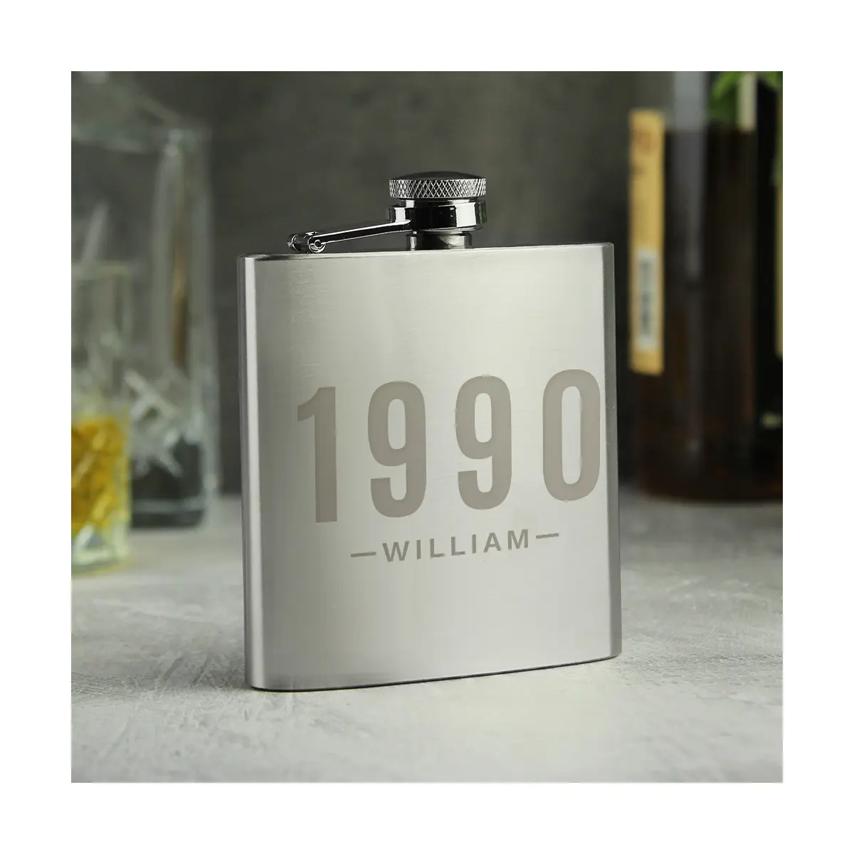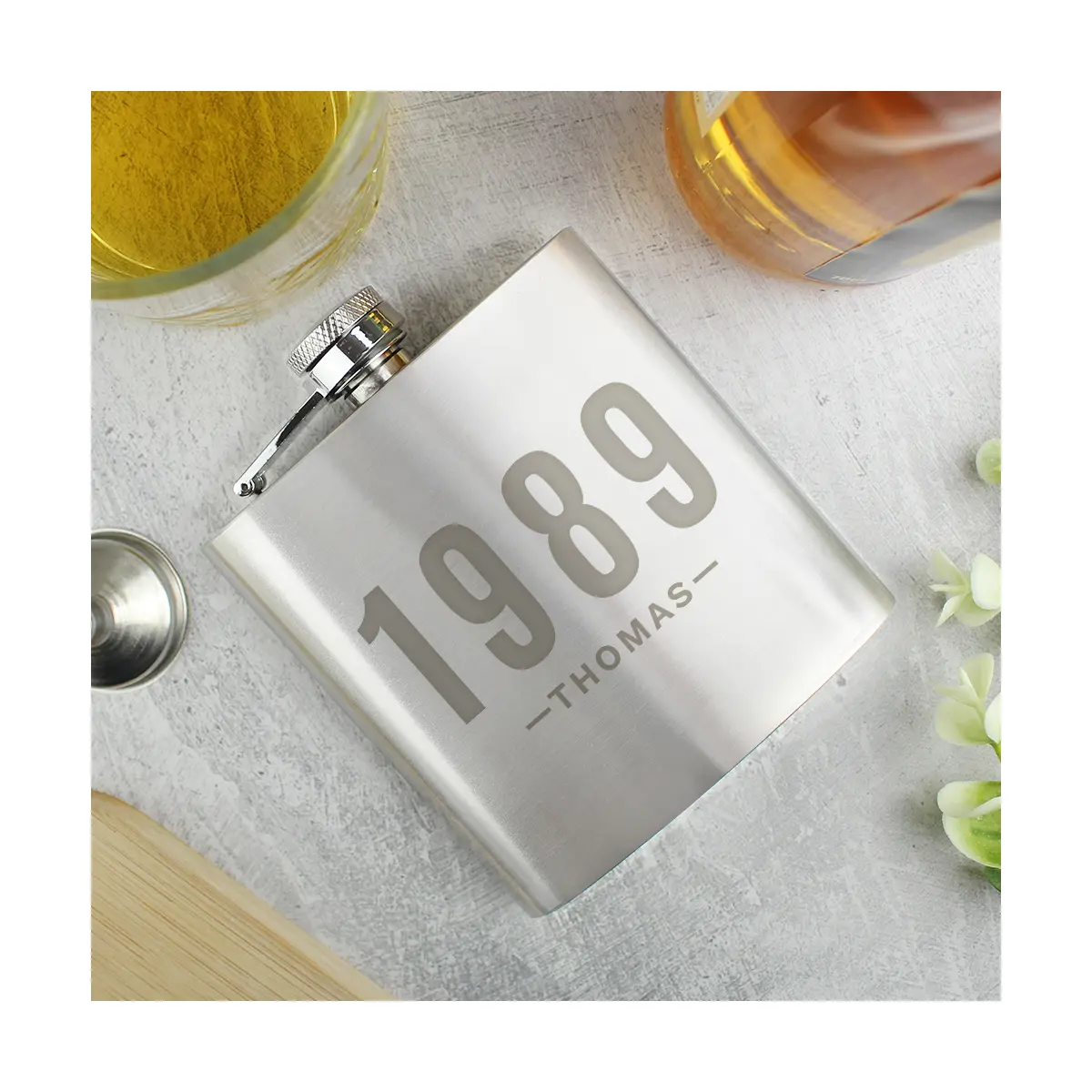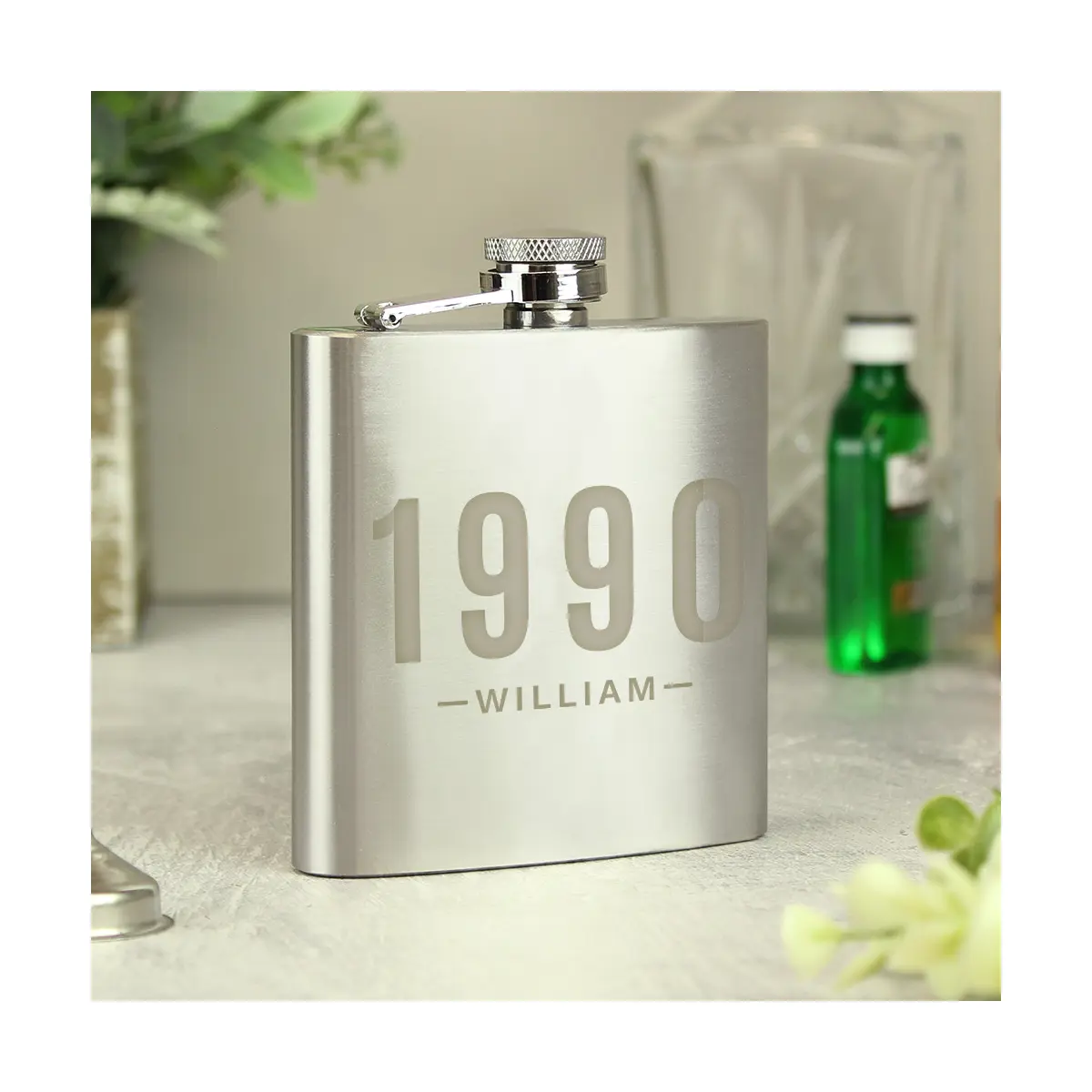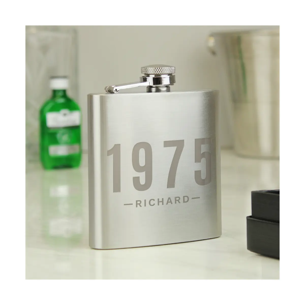 Treat the man in your life to his very own Personalised Date & Name Hip Flask. Made from stainless steel, this hip flask can hold 6oz of his favourite tipple. The flask can be engraved with a year (up to 4 numbers) and a name (up to 12 characters) – to make it an even more special gift. The personalisation will appear in bold uppercase letters. This elegant present comes packaged in a presentation box.