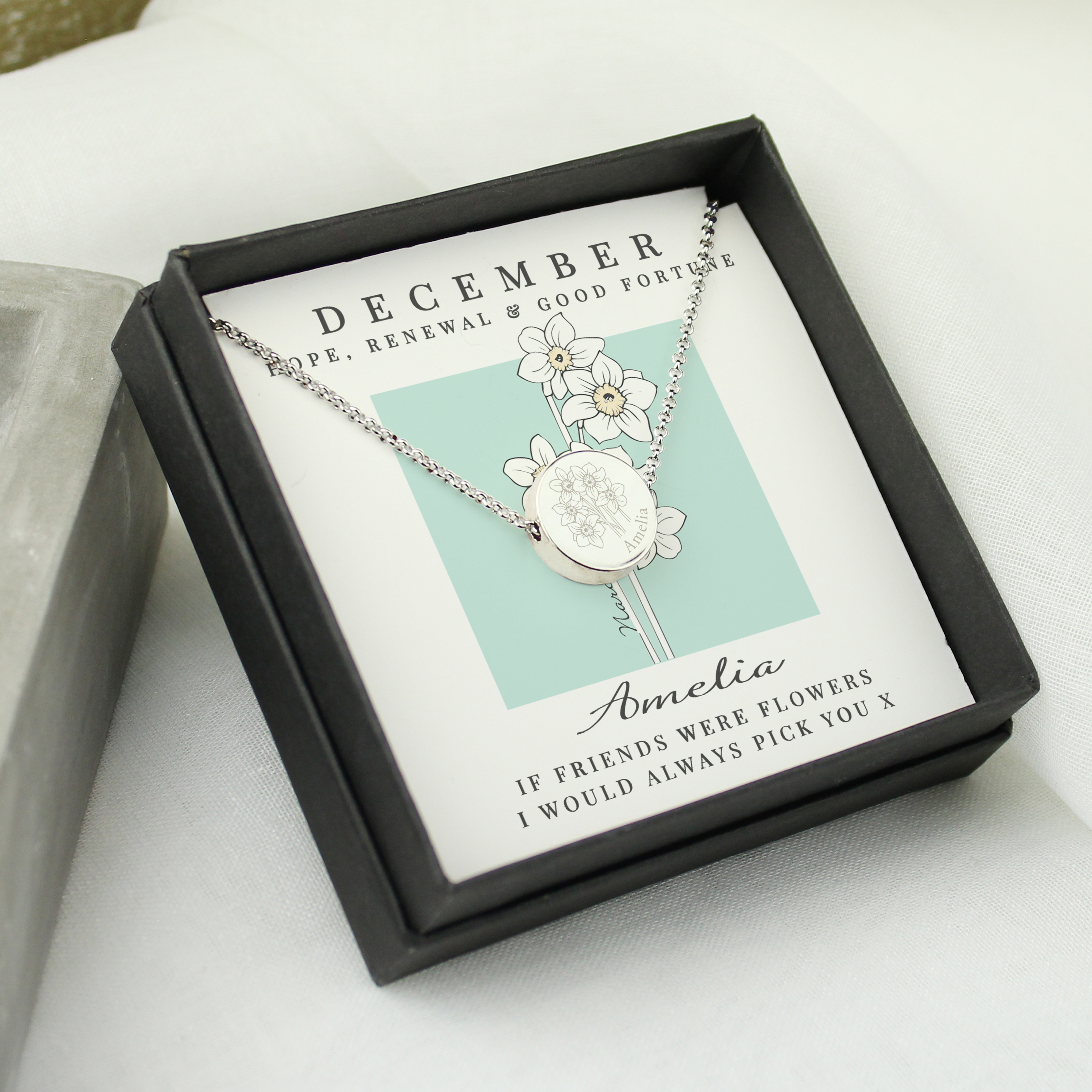 This December Birth flower necklace and box makes the perfect gift for any occasion.