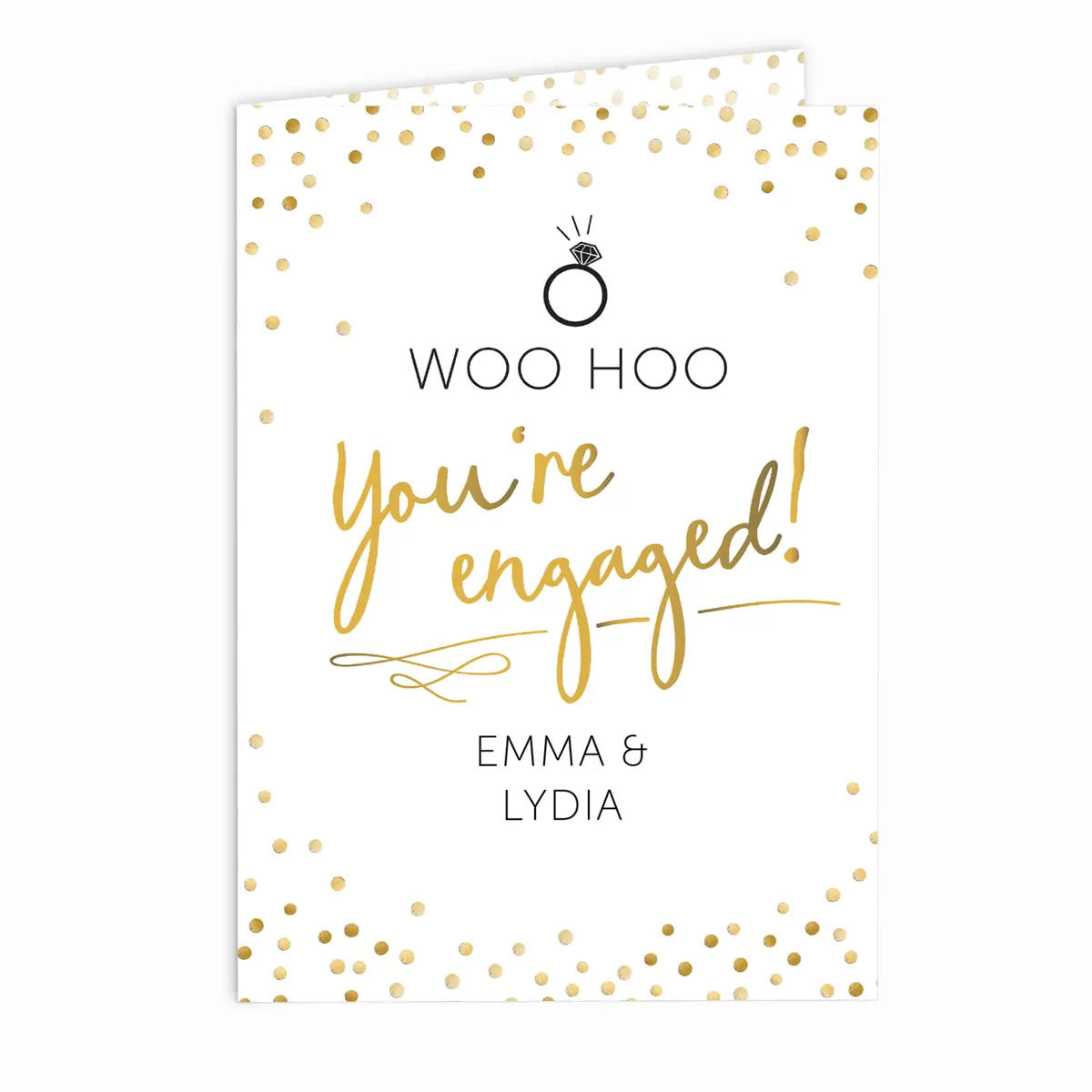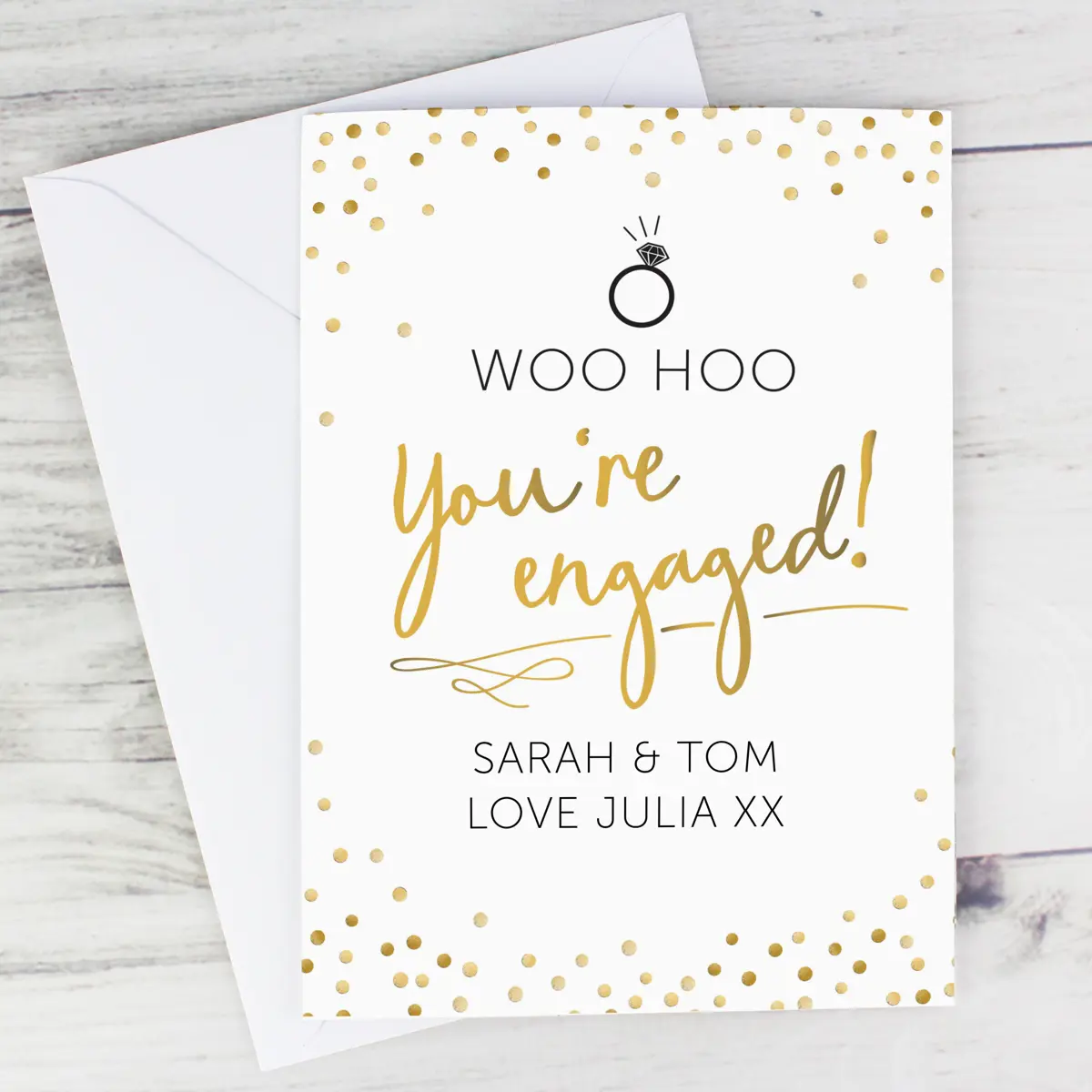 Celebrate the exciting news of an engagement with this bright and modern personalised card. Featuring the cheerful fixed words “Woo Hoo” and “you’re engaged!” along with a sweet ring icon, it is a thoughtful way to share your joy with the happy couple.