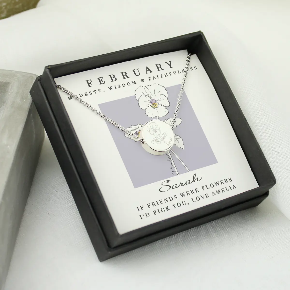 Personalised February Birth Flower Necklace and Box
