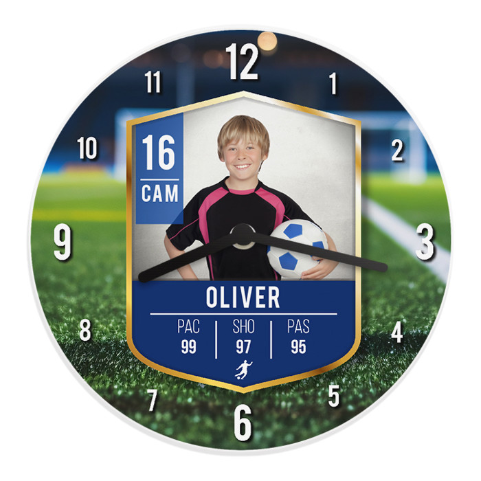 This unique wall clock combines the excitement of their favourite sport with a personal touch, featuring a custom football card design where you can upload a photo of your child.