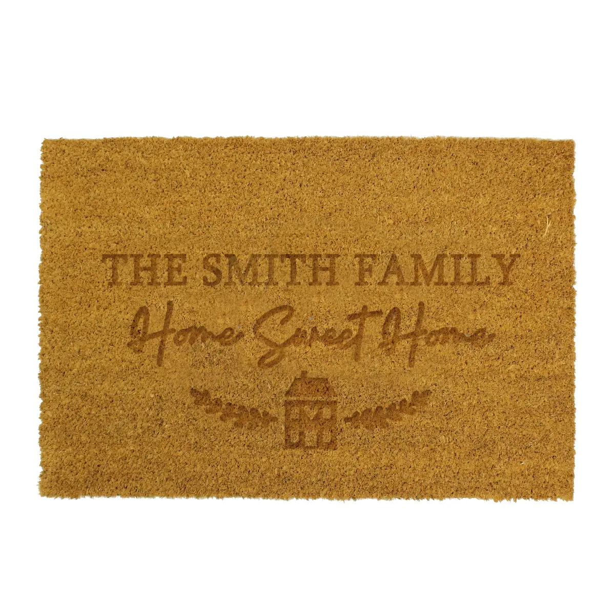 This coir, non-slip rectangle doormat can be personalised with a message over 1 line up to 20 characters above the fixed text 'Home Sweet Home'