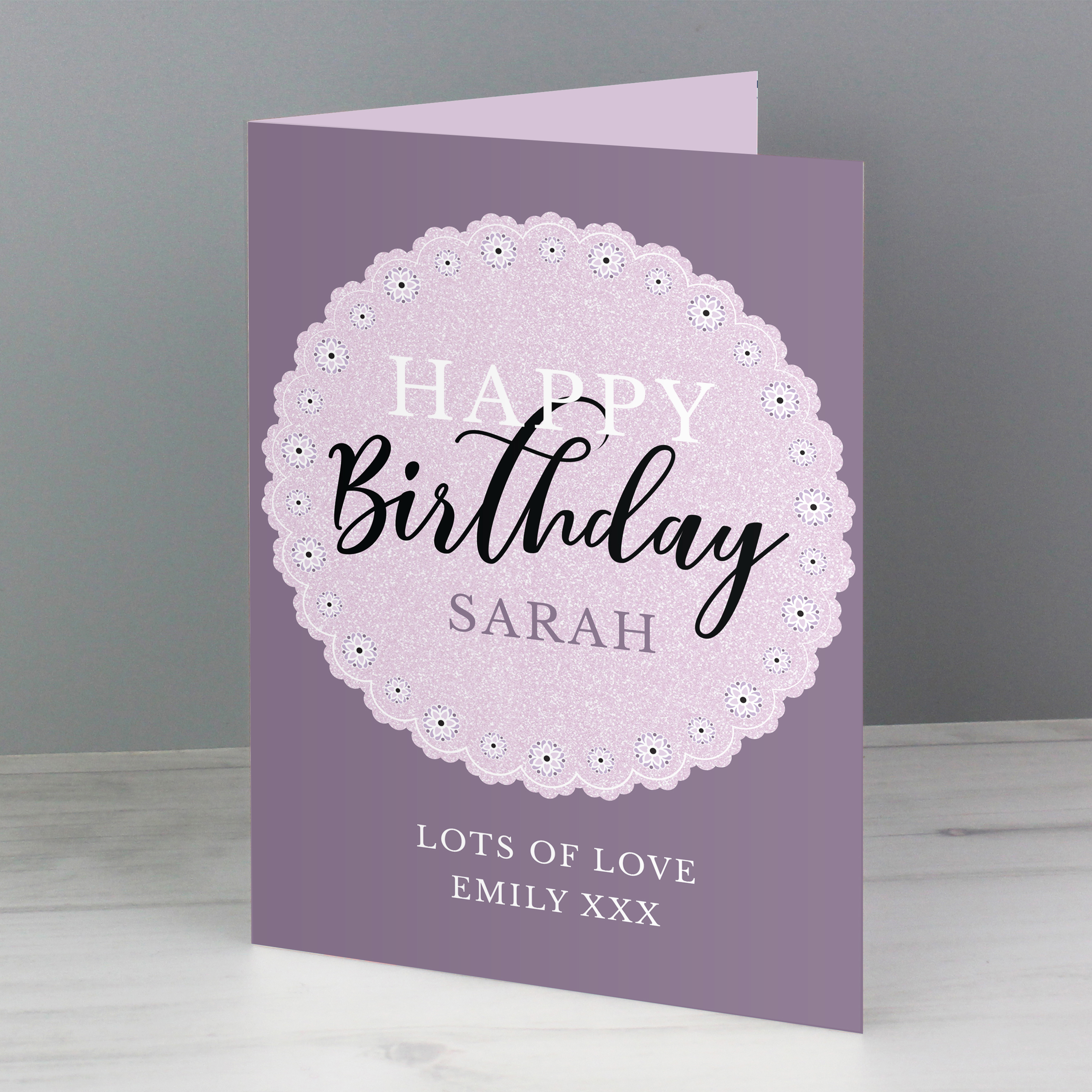 Add a touch of elegance to their special day with this personalised lilac lace birthday card. Featuring a delicate lace-inspired design and the fixed words “Happy Birthday”, it’s a beautiful way to make the occasion feel truly personal.