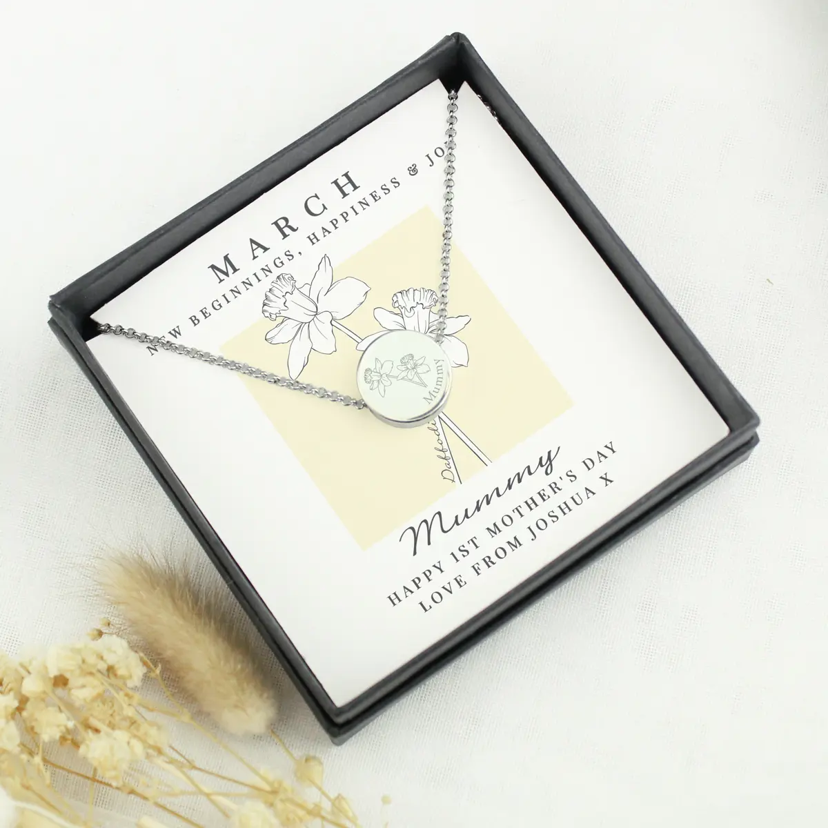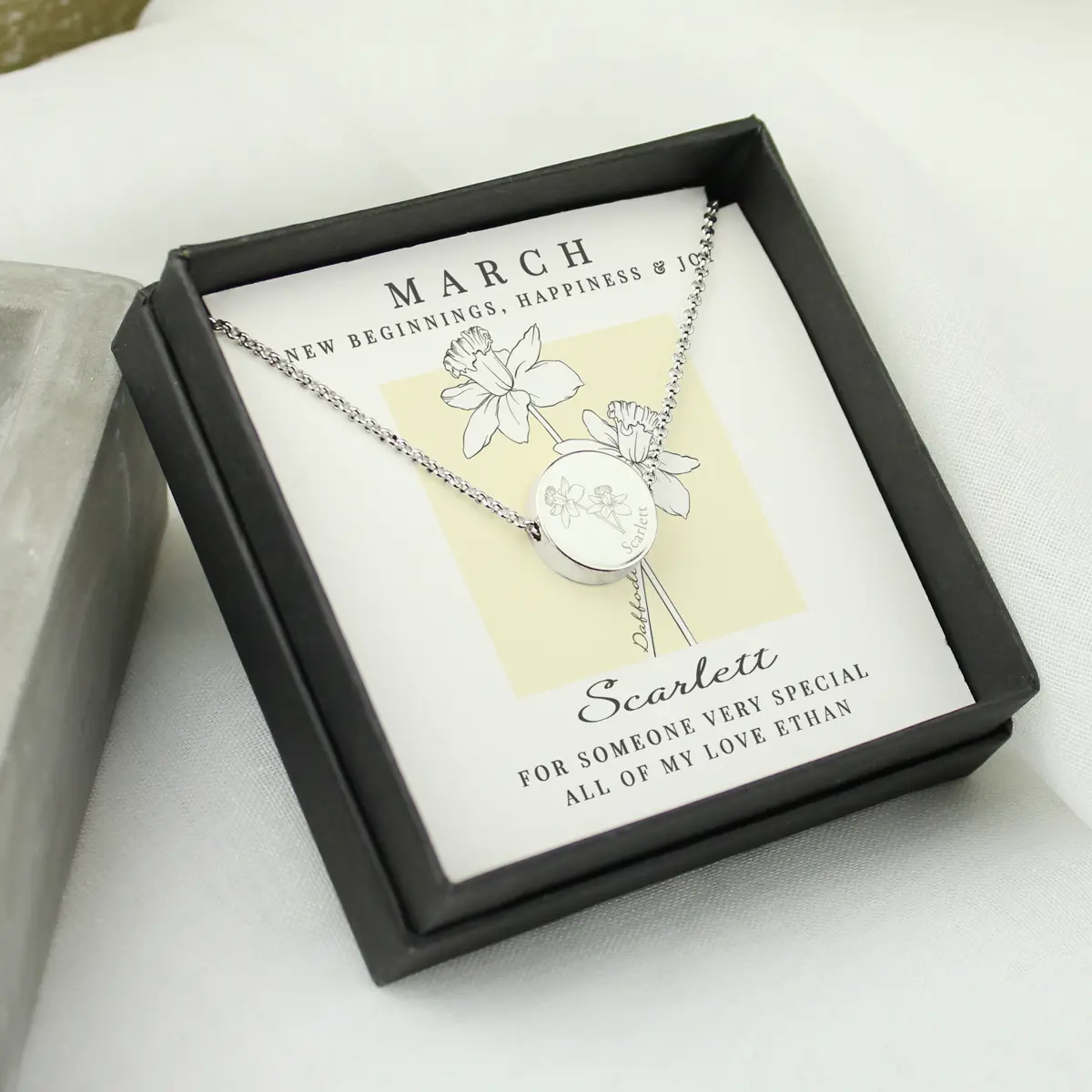 Personalised March Birth Flower Necklace and Box
